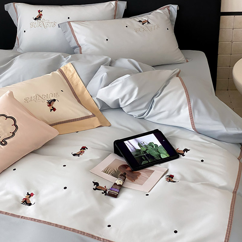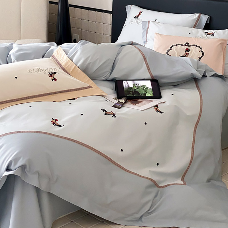 卡通高端长绒棉纯棉四件套小狗可爱刺绣被套床上用品清新蓝香槟色