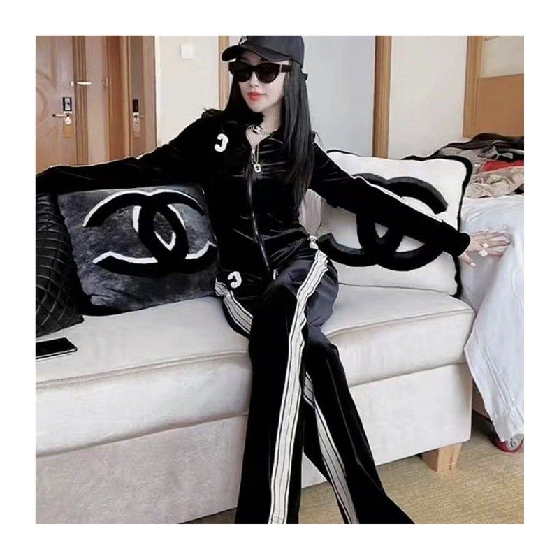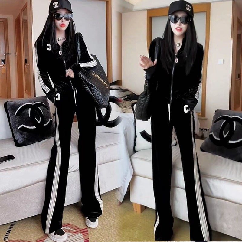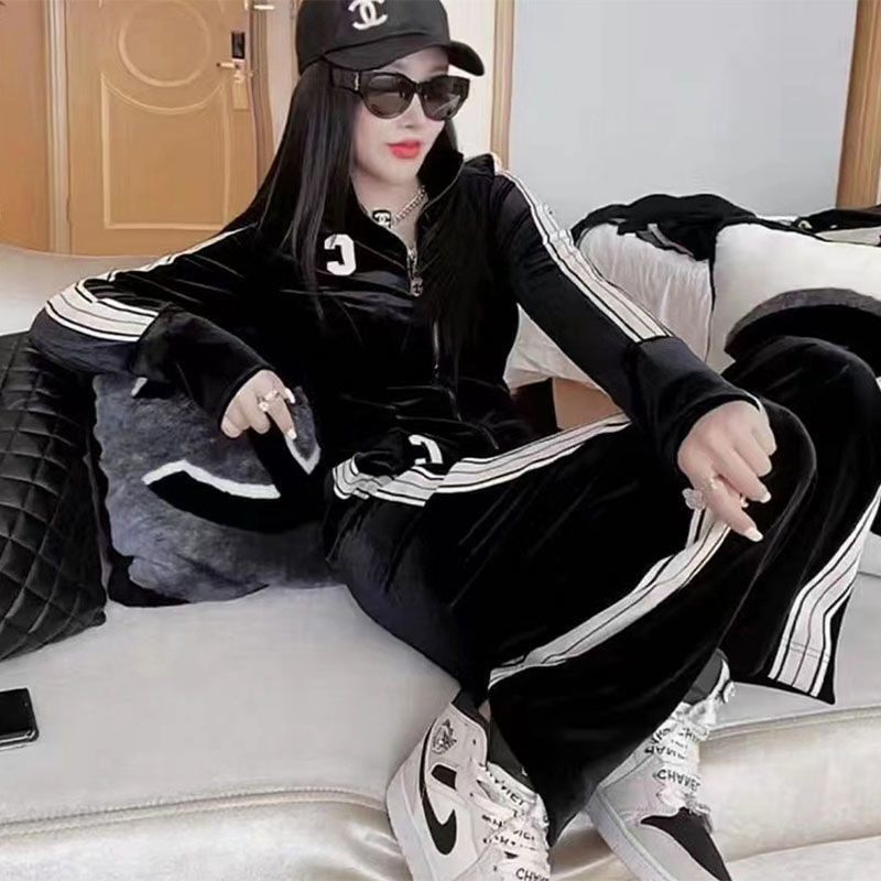 金丝绒休闲运动套装女秋冬季加绒加厚侧杠C字卫衣阔腿裤两件套潮