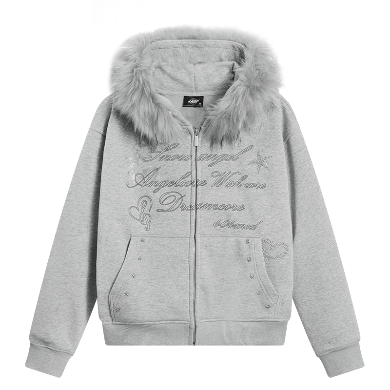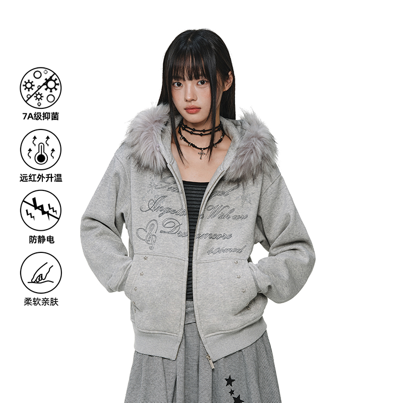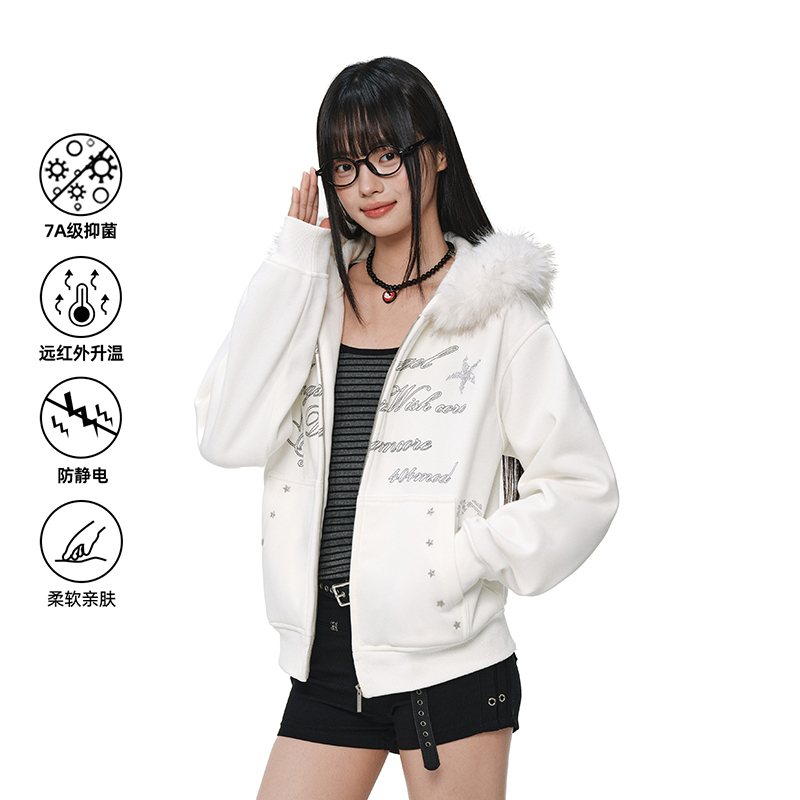 404MOB烫钻字母设计冬季大毛领加厚加绒外套女款短款连帽开衫卫衣