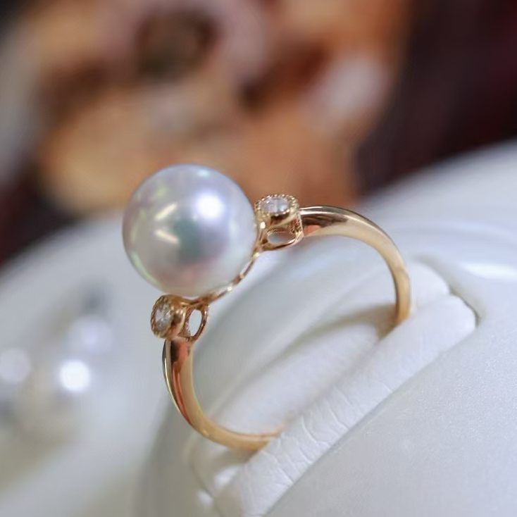 18k金锆石9-10mm淡水珍珠戒指配件简约大气百搭款裸珠diy戒托空托