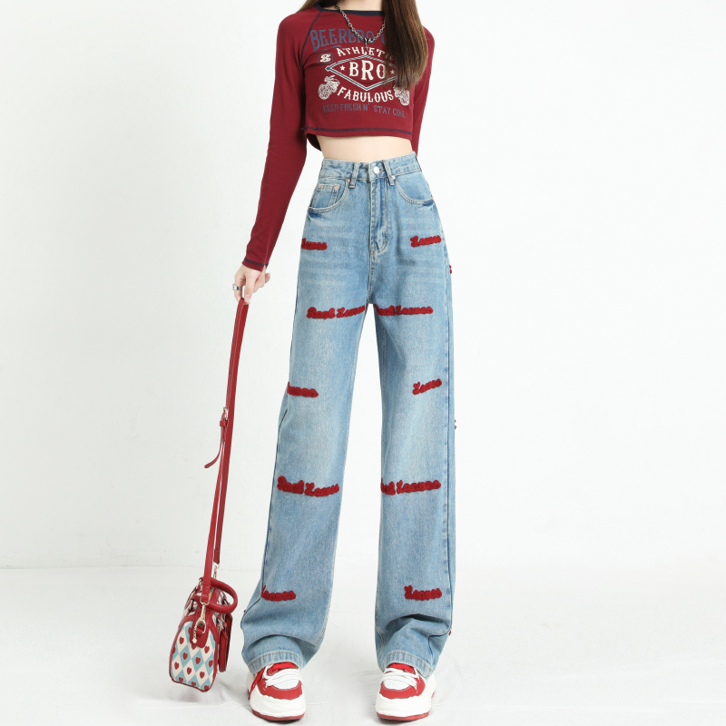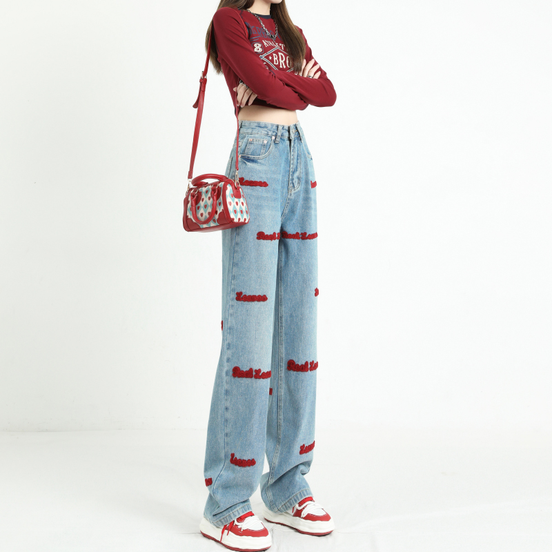 高腰字母刺绣牛仔裤女春秋2025新款设计感小众直筒宽松显瘦阔腿裤