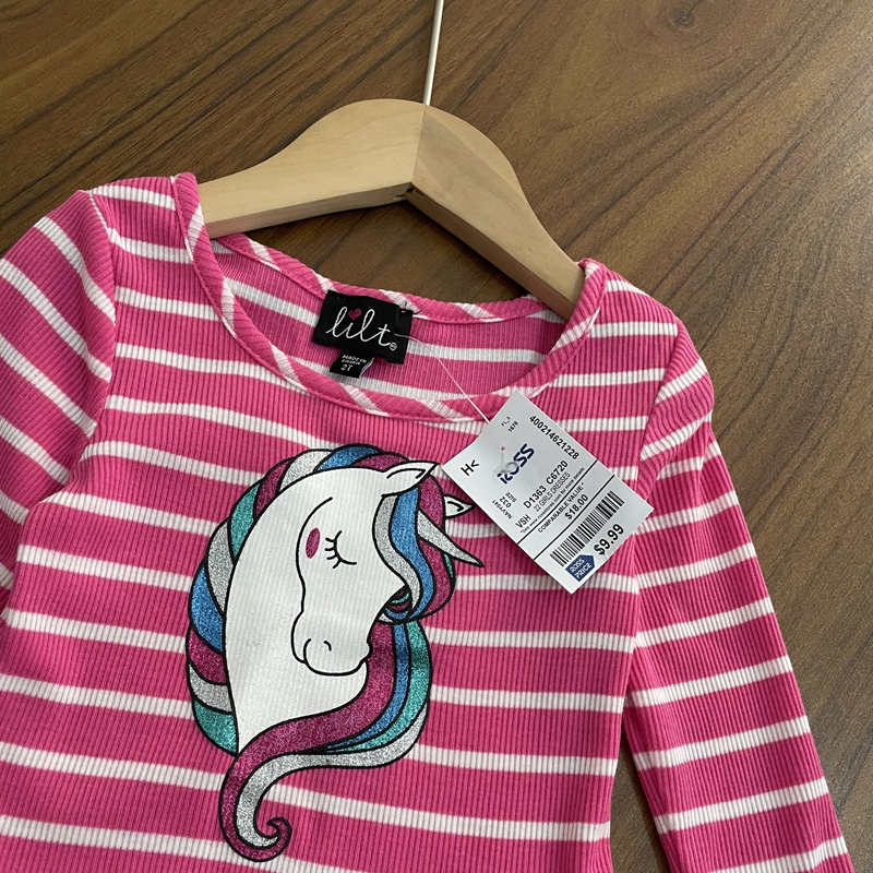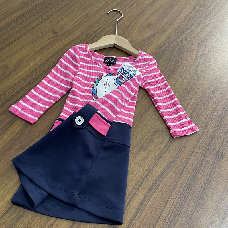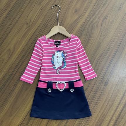 女童原单长袖连衣裙小童圆领条纹卡通图案甜美春秋新款裙子