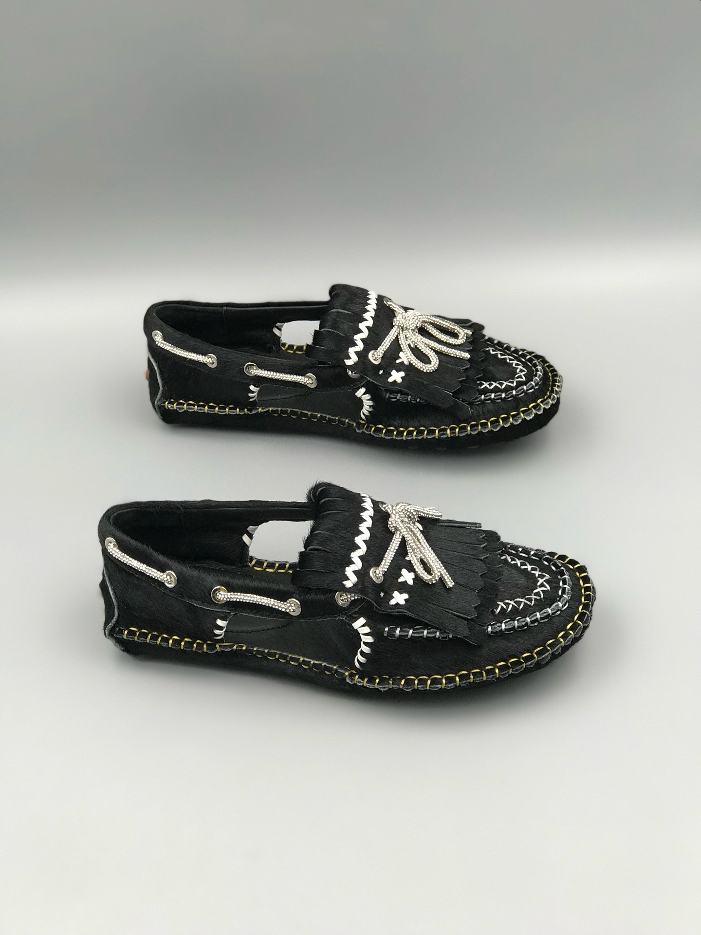 出欧原单 手工缝制 黑色马毛面配皮里 镂空平底豆豆鞋 软底女单鞋
