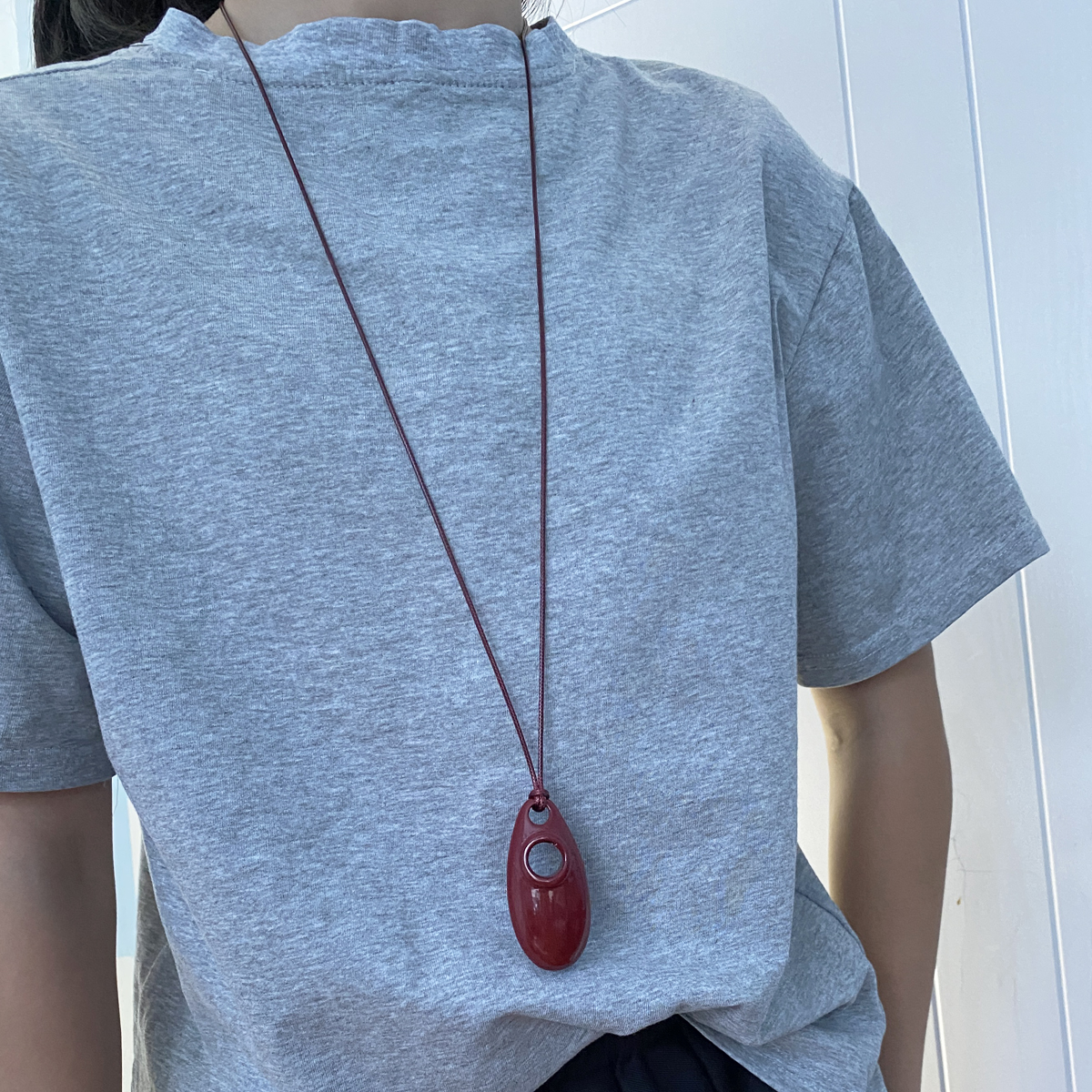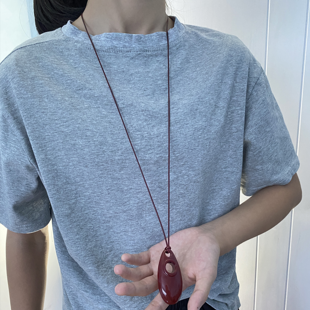 日韩小众欧尼plow同款酒红色几何水滴项链女小羊皮绳长毛衣链吊坠