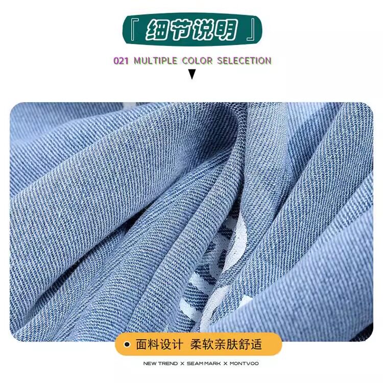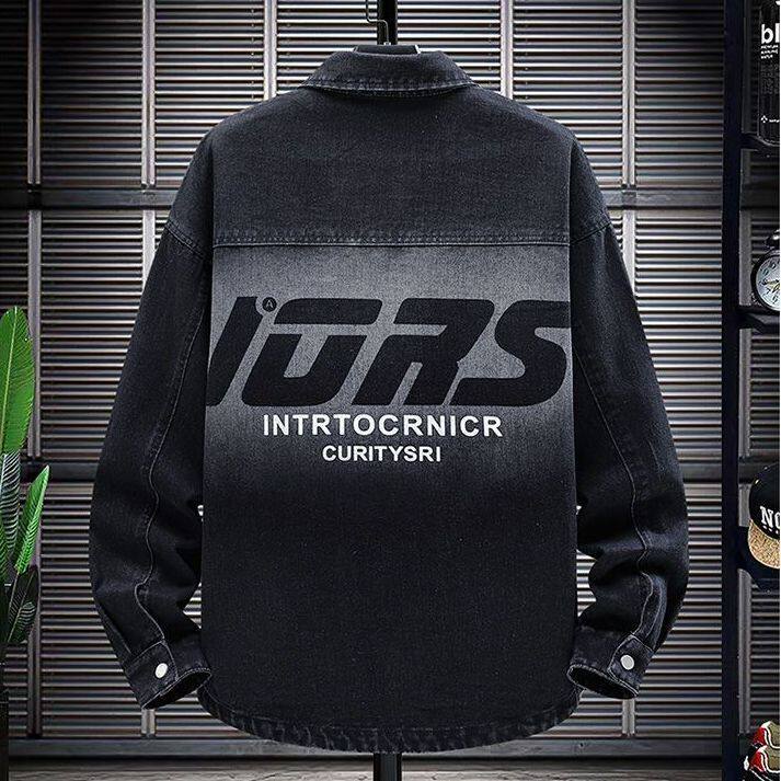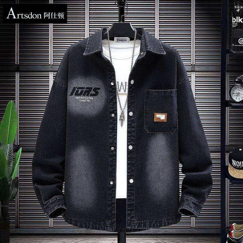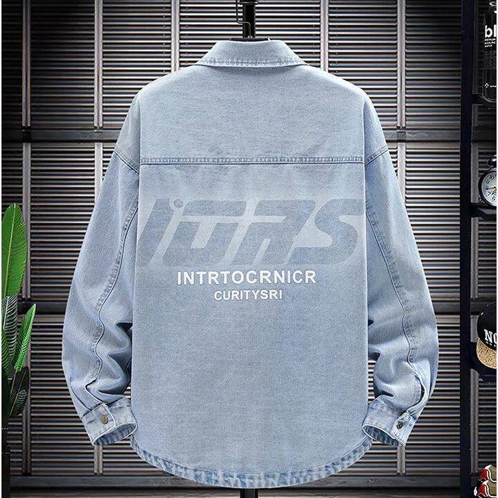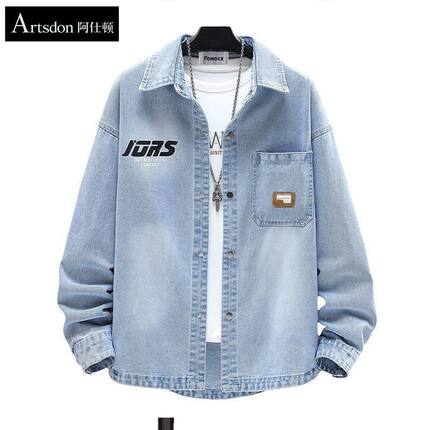 春秋季青少年潮流翻领休闲字母牛仔衬衫夹克夏季薄款宽松外套男生