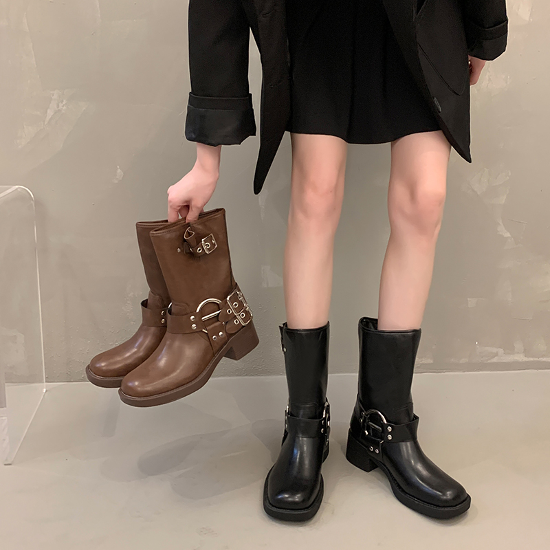 马丁靴女秋季粗跟西部牛仔短靴2025新款秋冬复古英伦风棕色骑士靴