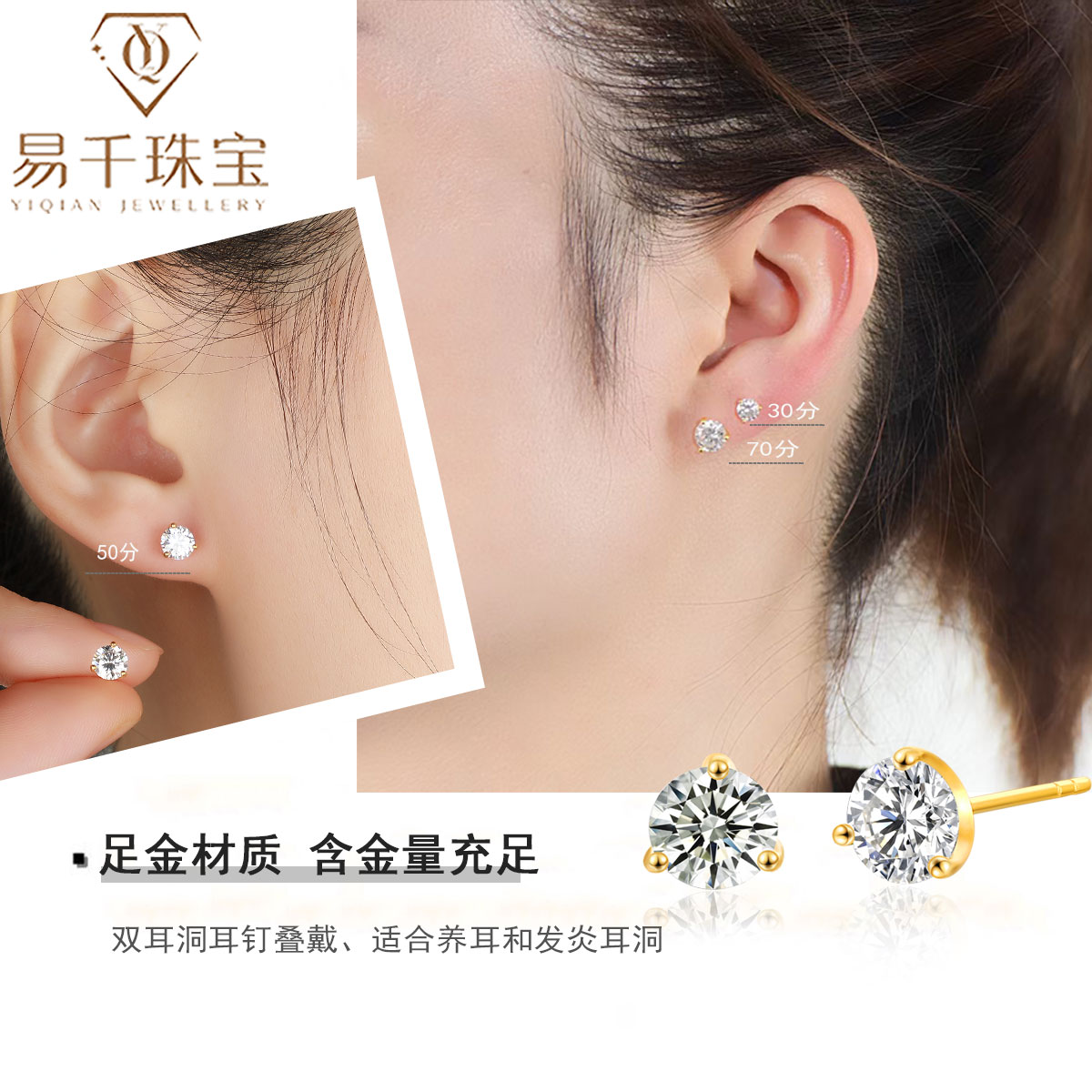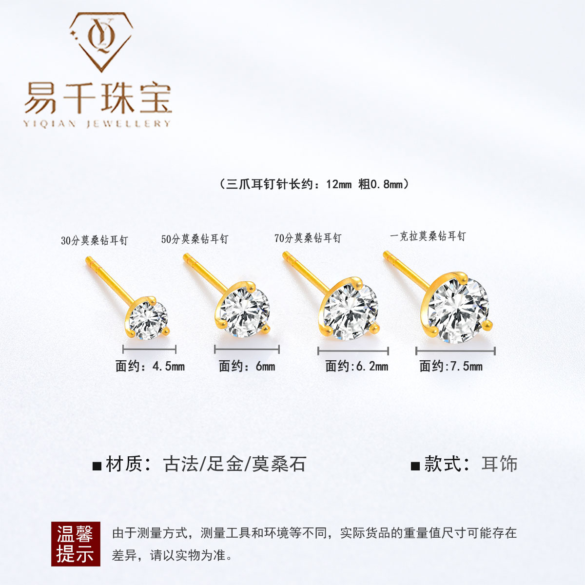 黄金耳钉999足金一克拉镶莫桑钻耳饰纯金养耳洞单只免摘送女友