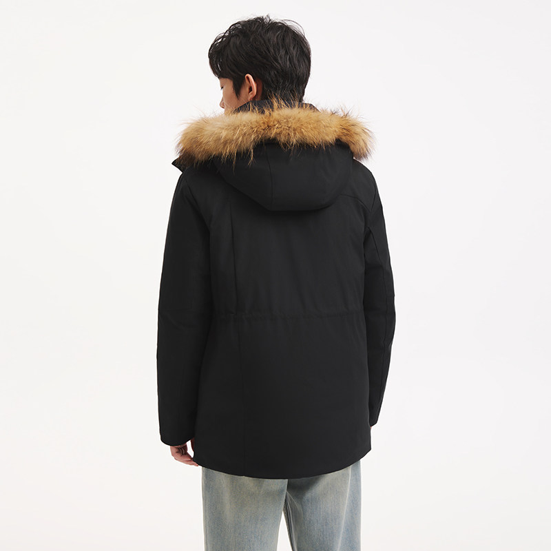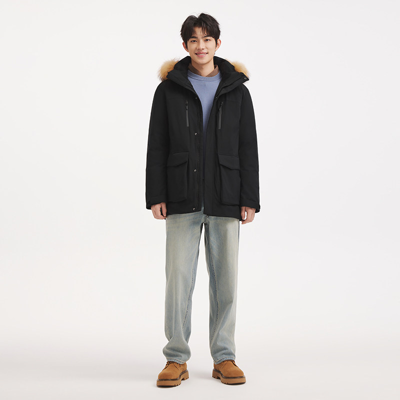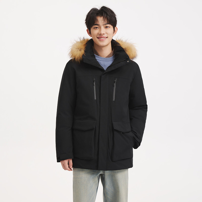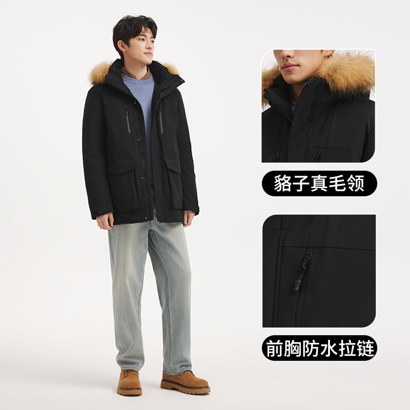 热风男士羽绒服2025年冬季新款户外中长羽绒服毛领保暖工装羽绒服