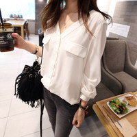 春夏新款韩版v领长袖雪纺衫宽松百搭衬衫时尚显瘦打底女衬衣上衣