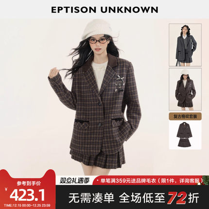 EPTISON时尚套装女2025冬季新款复古西装外套百褶短裙格纹两件套
