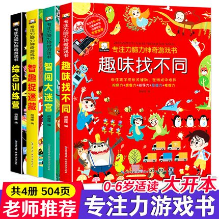 专注力训练大书益智游戏 全四册套装儿童神奇大脑开发思维训练营0-2-3-4-5-6岁观察力智力大迷宫找不同图画捉迷藏找茬绘本儿童书