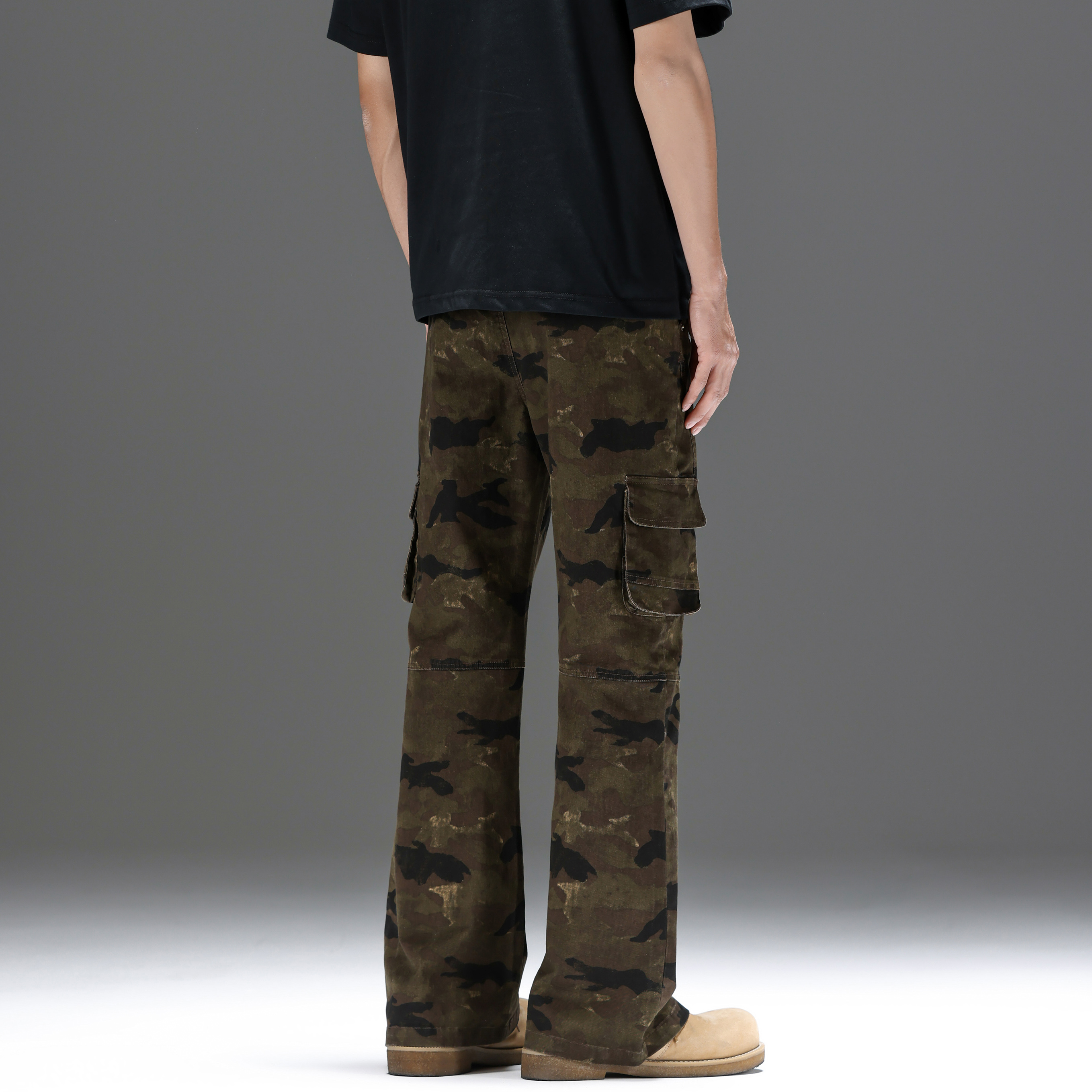 UNKNOWTAL 复古水洗迷彩多口袋修身微喇显瘦工装长裤
