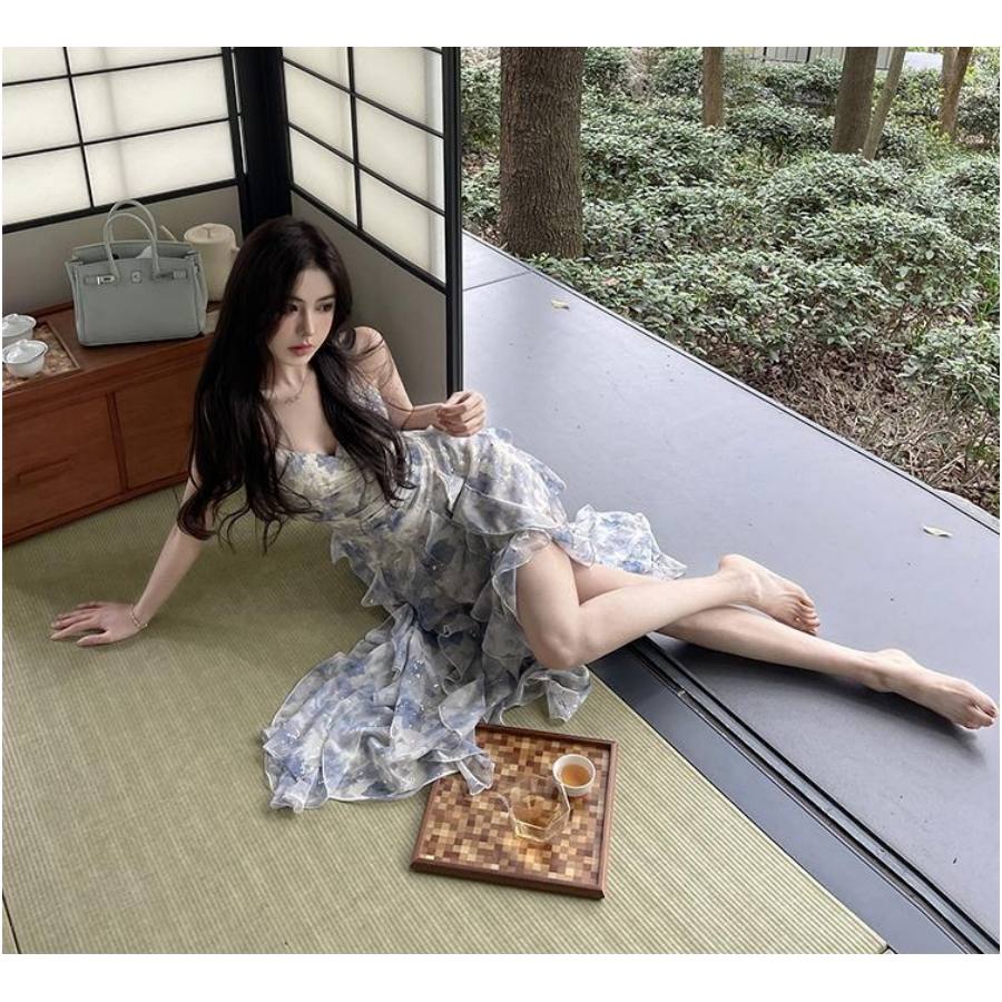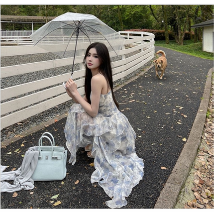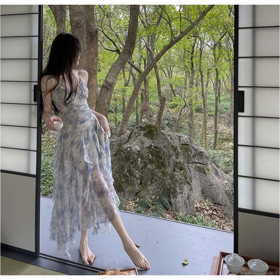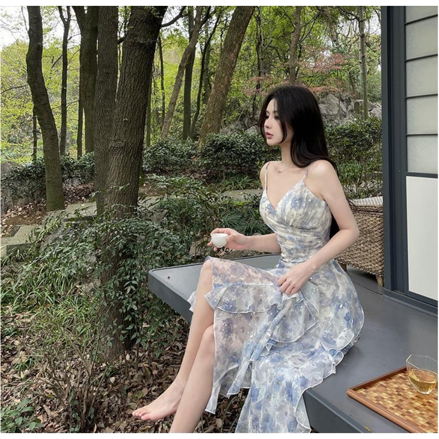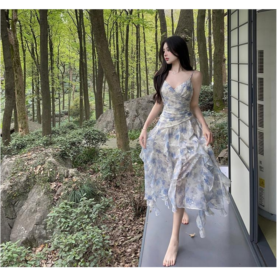海边度假风v领碎花晕染吊带连衣裙温柔韩系气质收腰不规则沙滩裙
