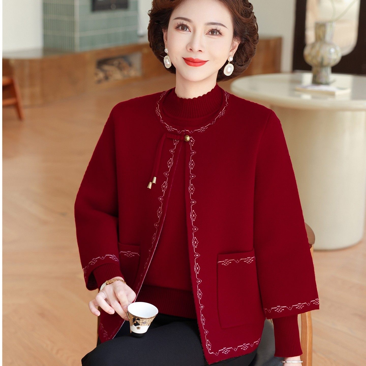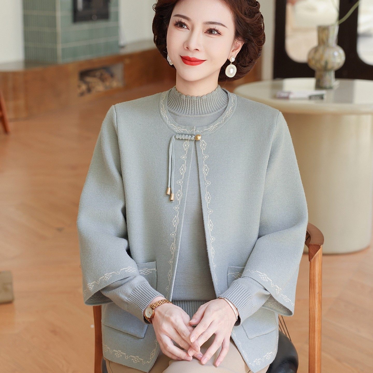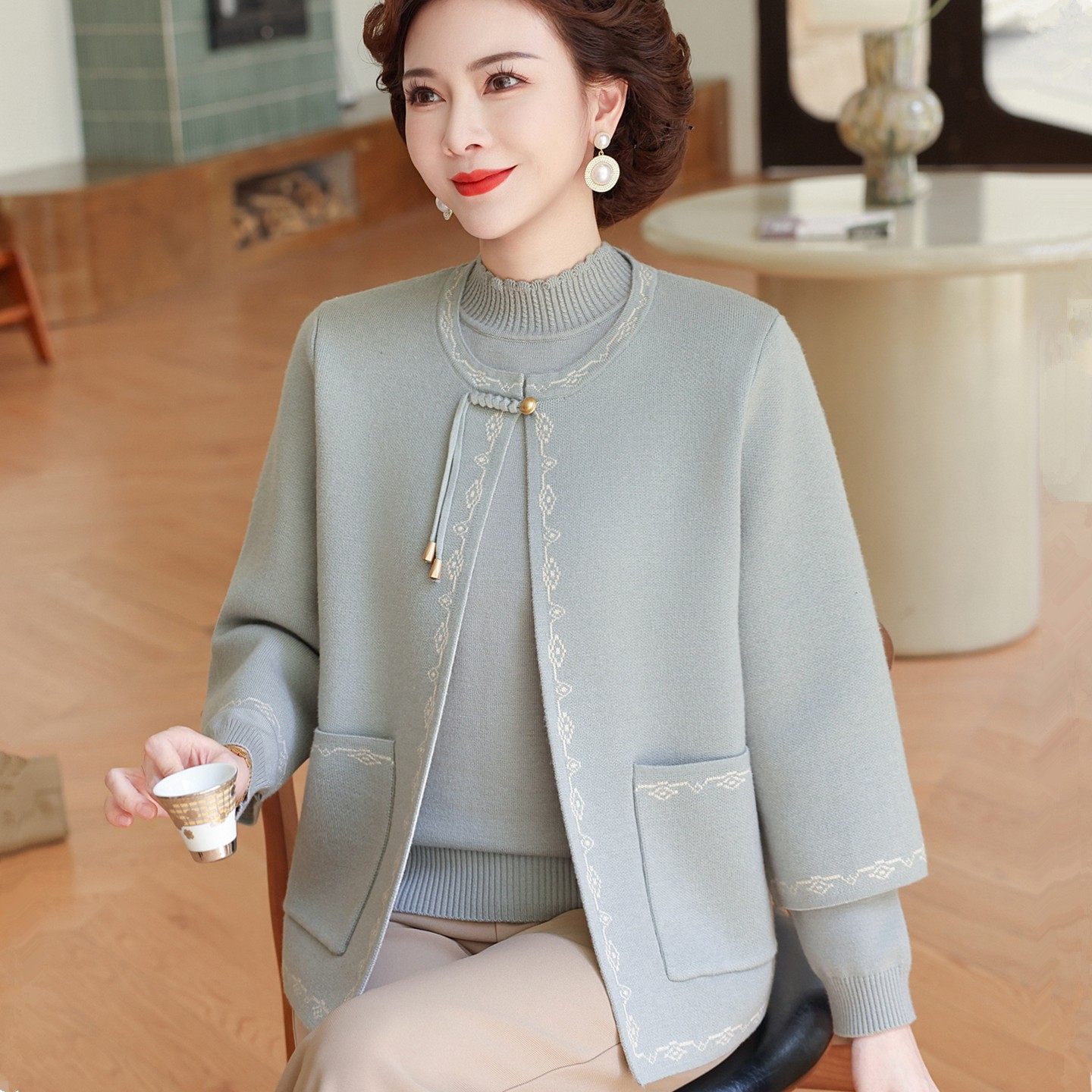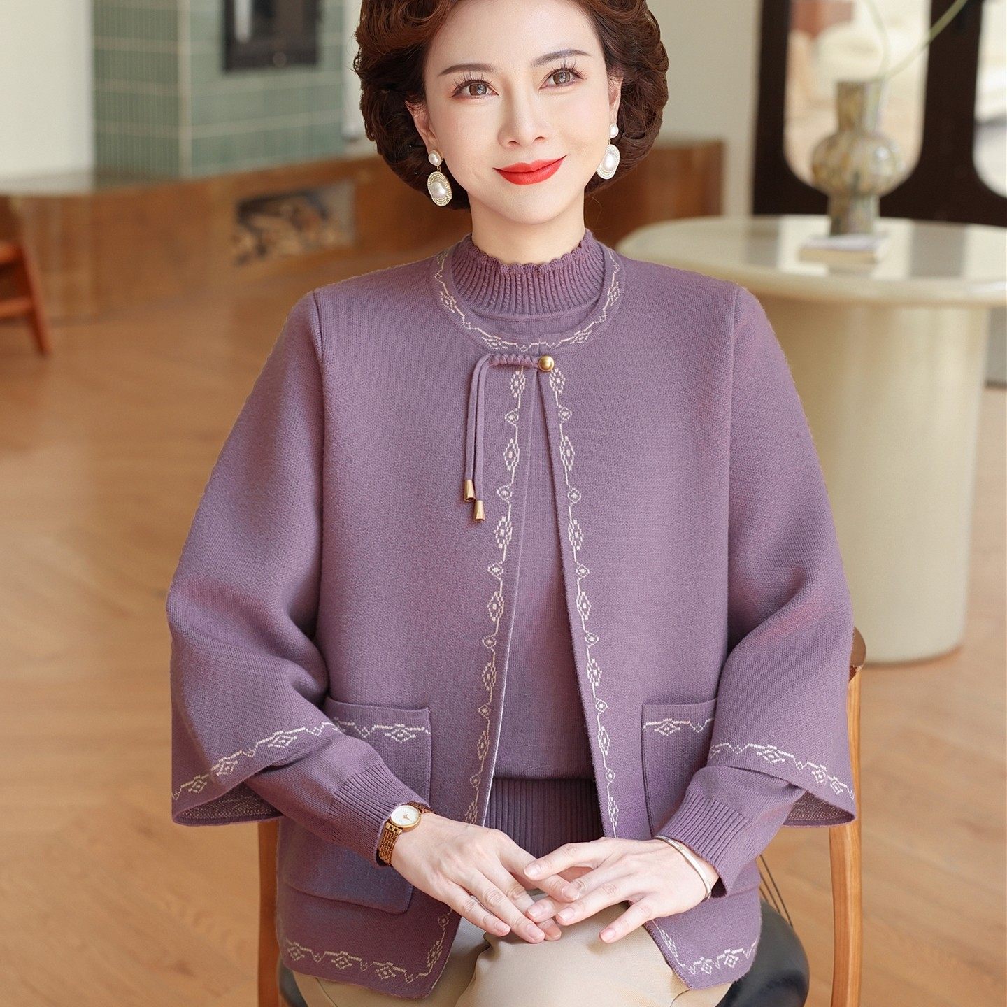 妈妈秋装新款针织两件套中老年洋气新中式秋冬毛衣外套妇女春开衫