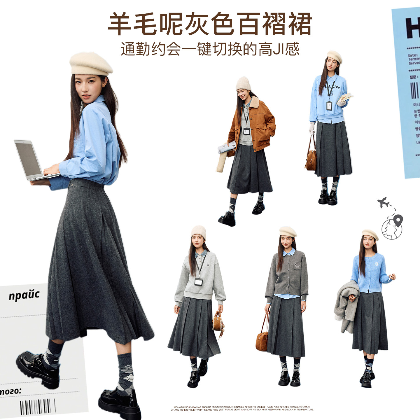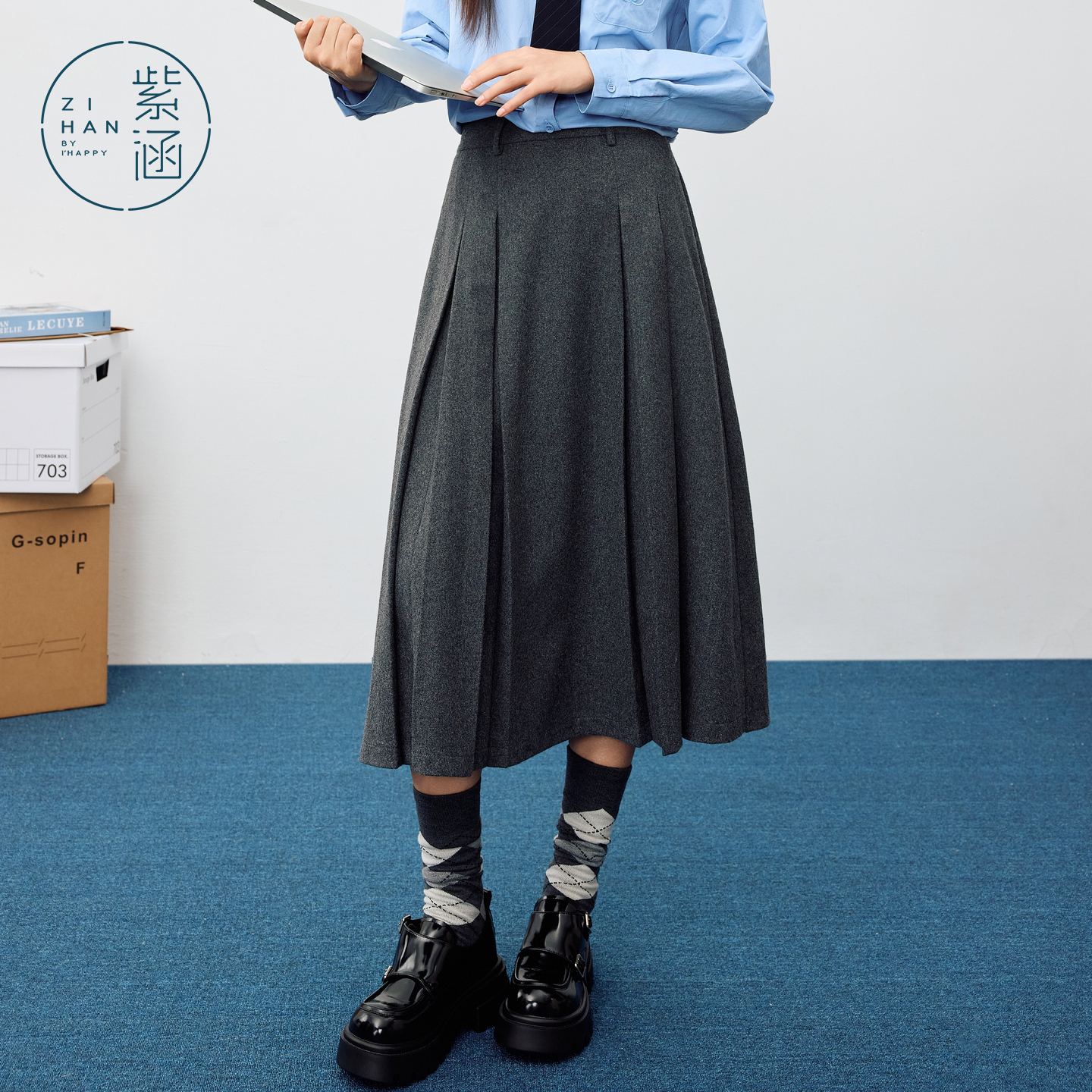 紫涵羊毛呢灰色半身裙女2025冬季新款简约通勤松紧高腰a字百褶裙