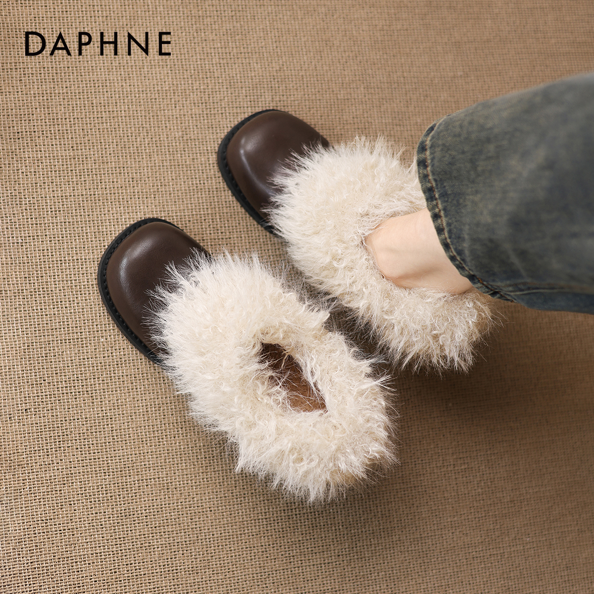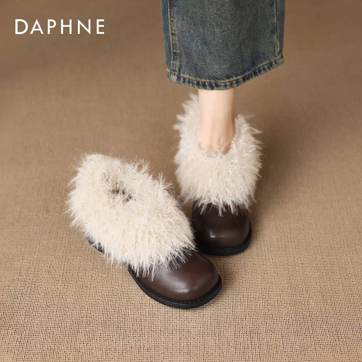 达芙妮玛丽珍毛毛鞋女2025新款冬季棉鞋雪地靴棕色皮鞋单鞋高跟鞋