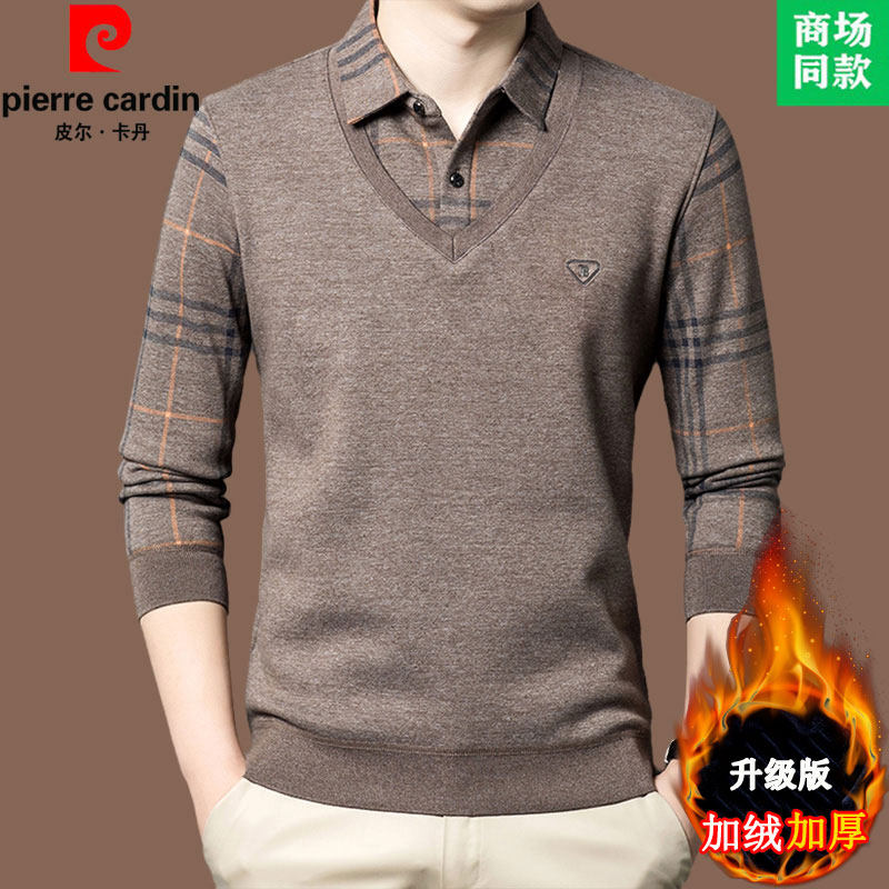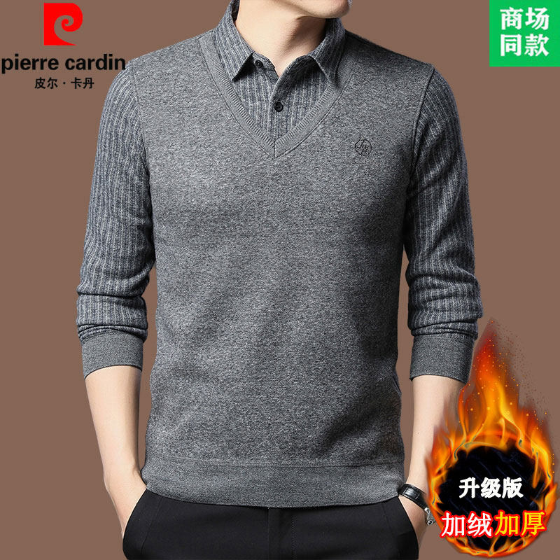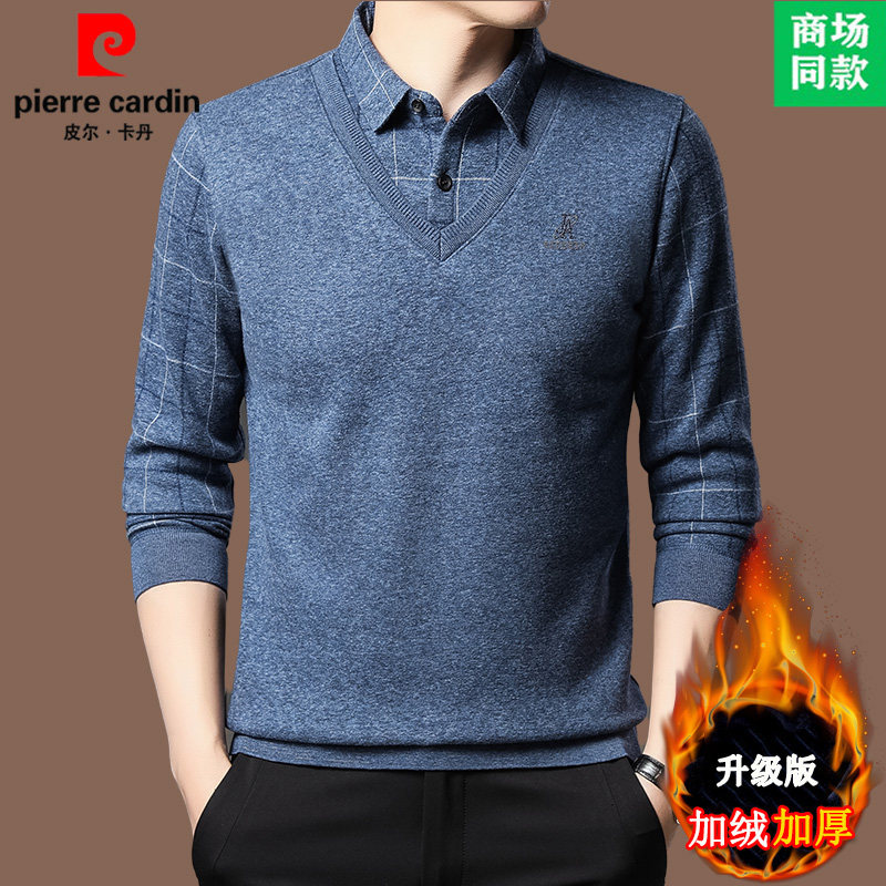 皮尔卡丹高端羊毛衫男假两件加绒保暖毛衣衬衫领加厚打底衫