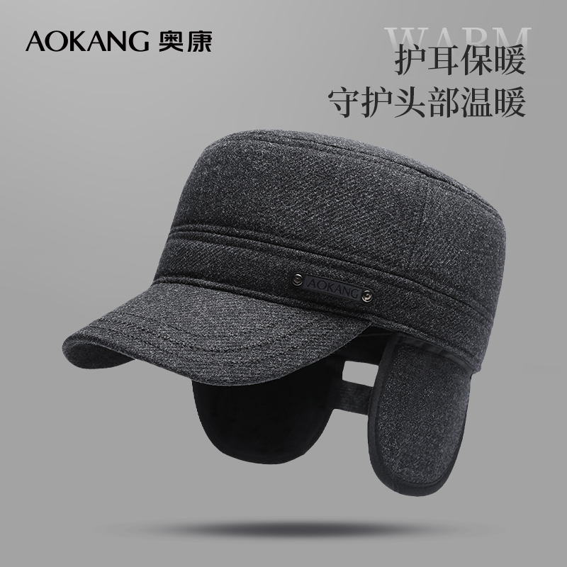 奥康2025新款秋冬中老年人男士平顶帽保暖冬季加厚护耳帽子送爸爸