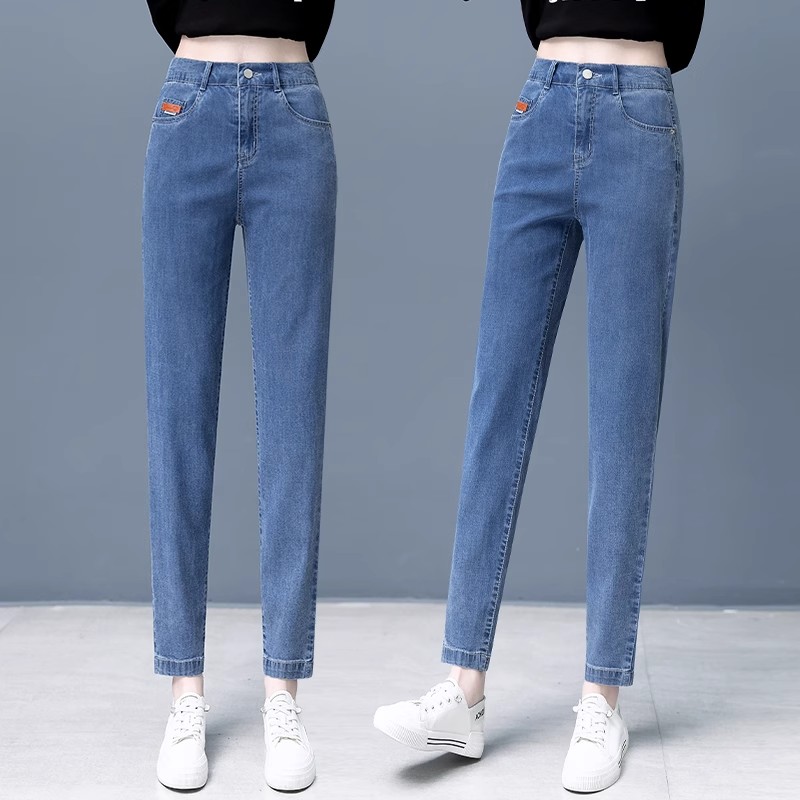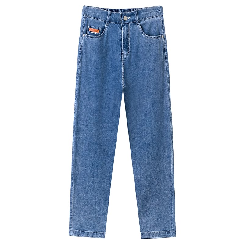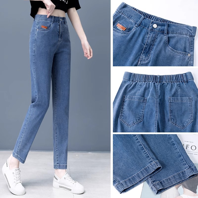 冰丝松紧腰高腰牛仔裤女2025年新款大码胖mm秋季薄款天丝哈伦老爹