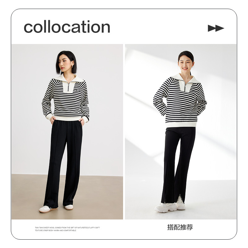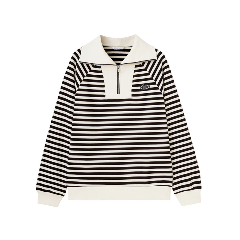 水云间半拉链翻领卫衣女黑白撞色条纹长袖上衣纯棉针织衫2025新款