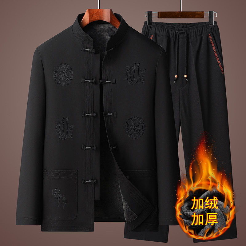 爷爷衣服冬季加绒加厚棉衣套装