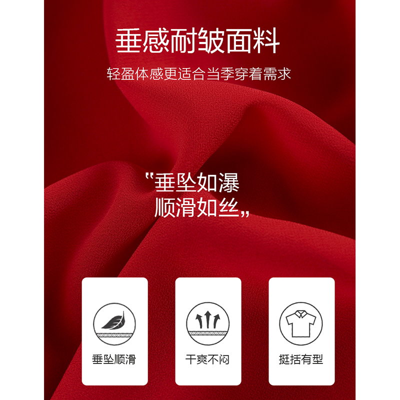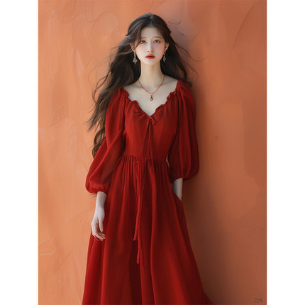 红色V领连衣裙女2025年春秋新款轻奢高级感裙子订婚敬酒回门礼服