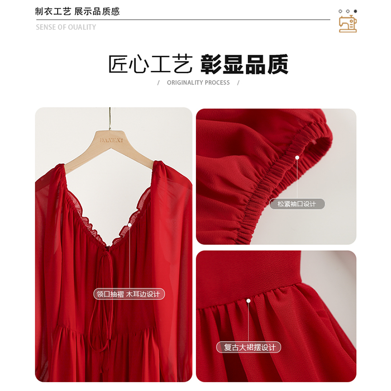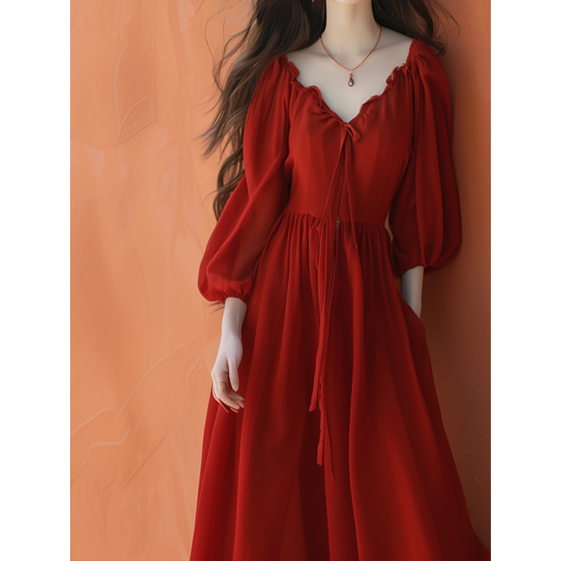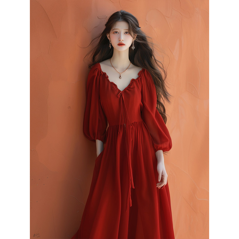 红色V领连衣裙女春秋回门礼服