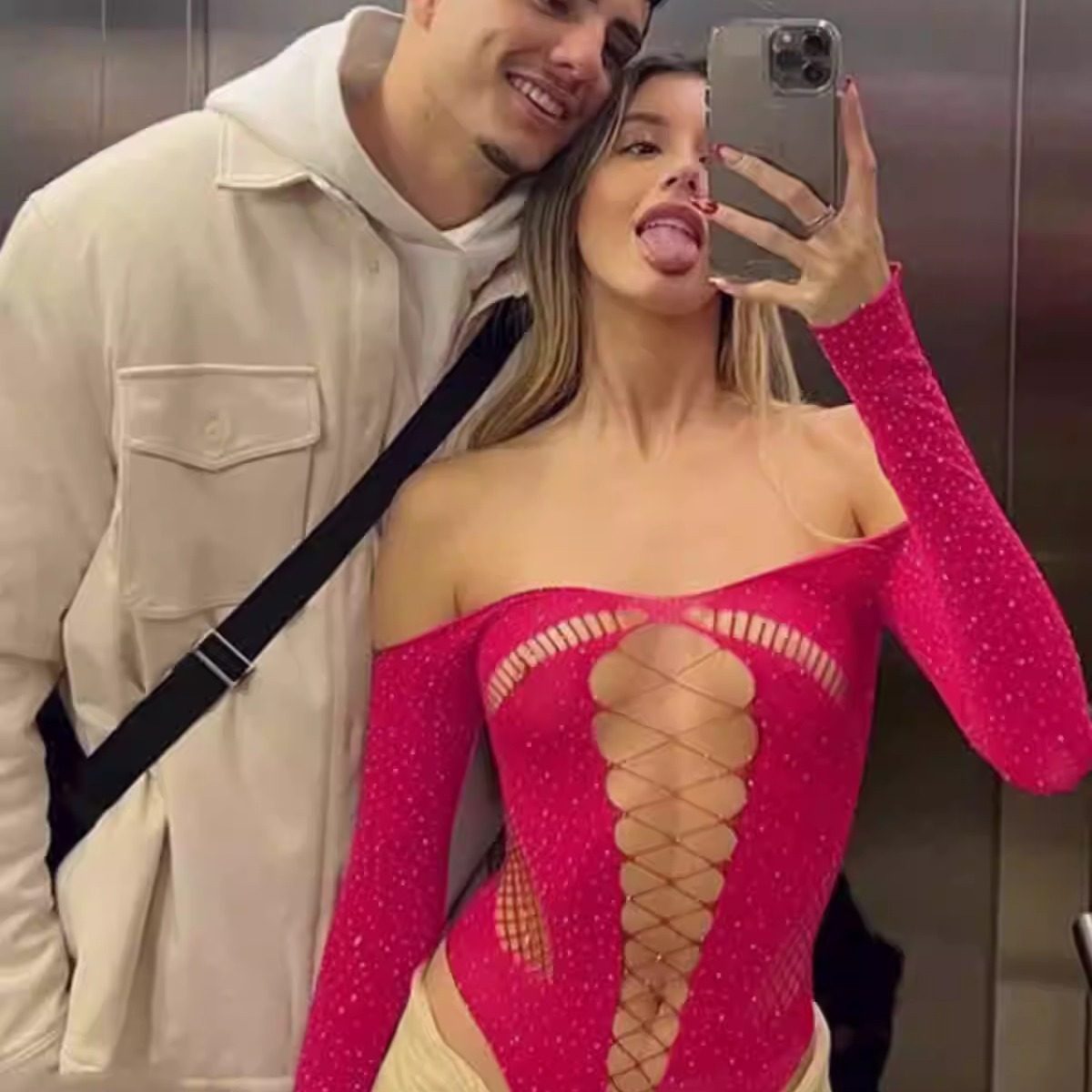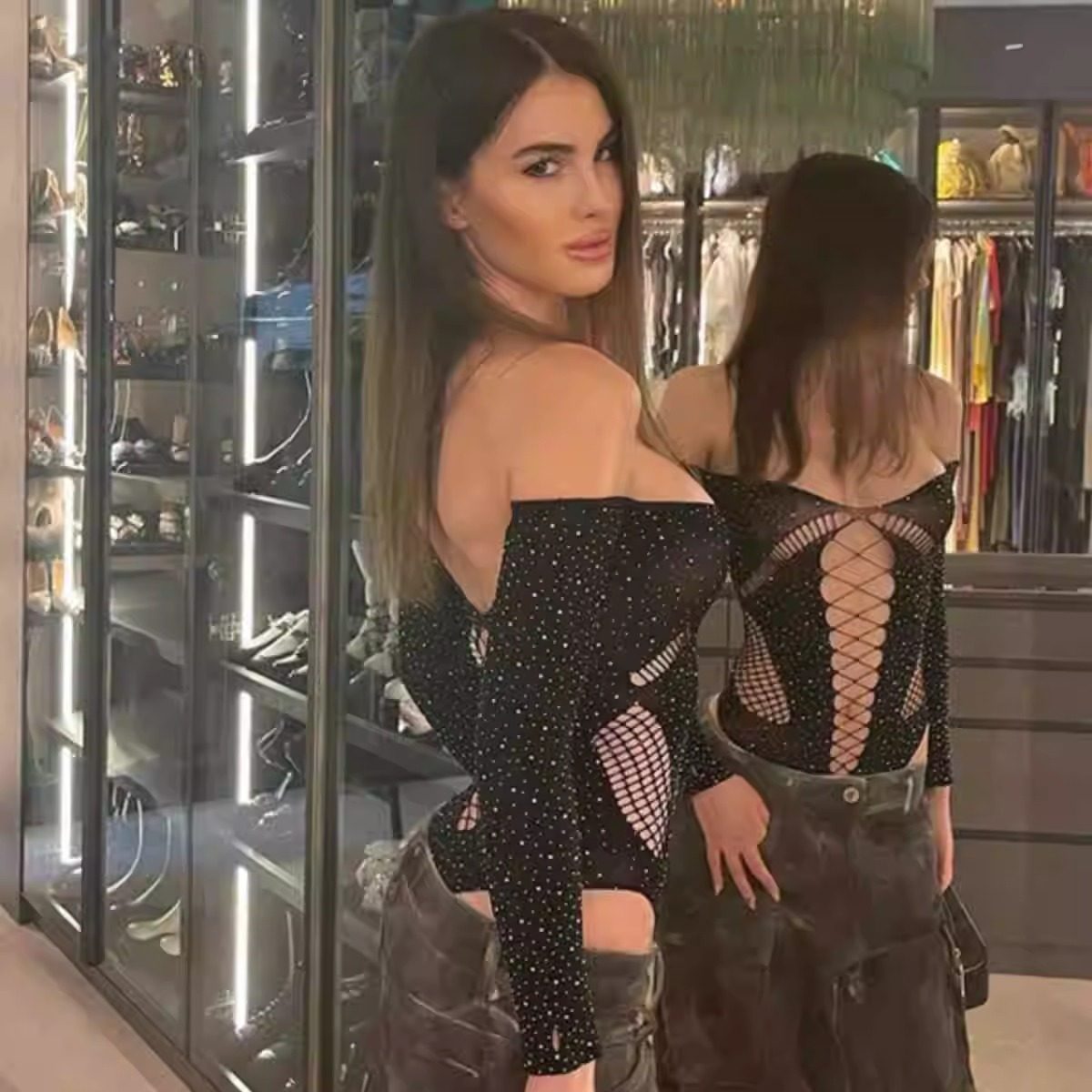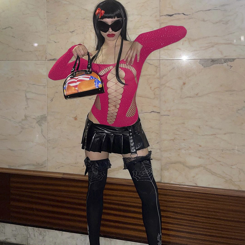 千禧辣妹风镂空烫钻一字肩长袖上衣Y2K性感修身显瘦内搭连体衣女