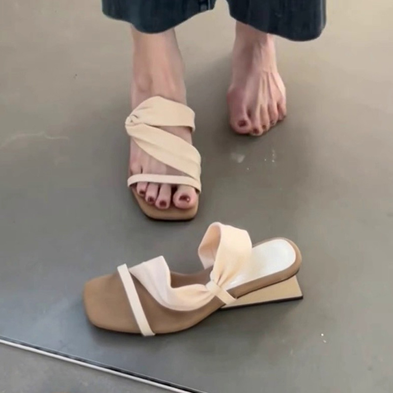 法式坡跟方头两穿凉鞋女2025夏季新款气质露趾高跟配裙子一字拖鞋