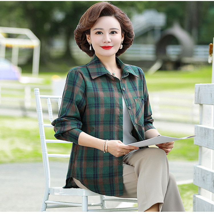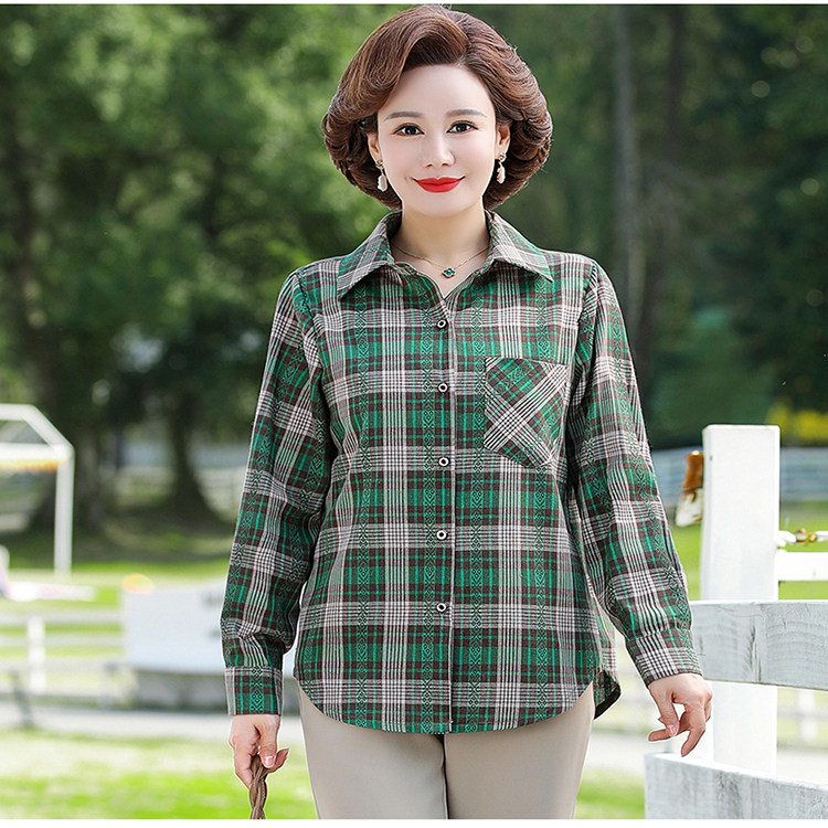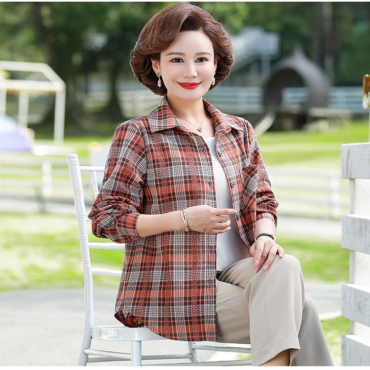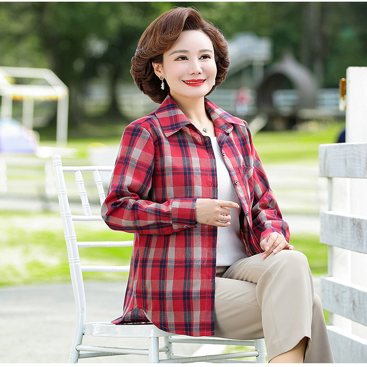 中老年纯棉长袖格子衬衫妈妈装女士宽松大码全棉衬衣薄款上衣外套
