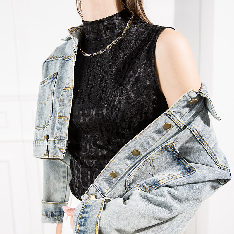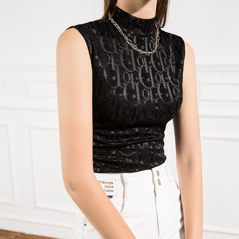 2025秋季新款立领蕾丝打底背心女修身字母欧洲站黑色春秋无袖衫