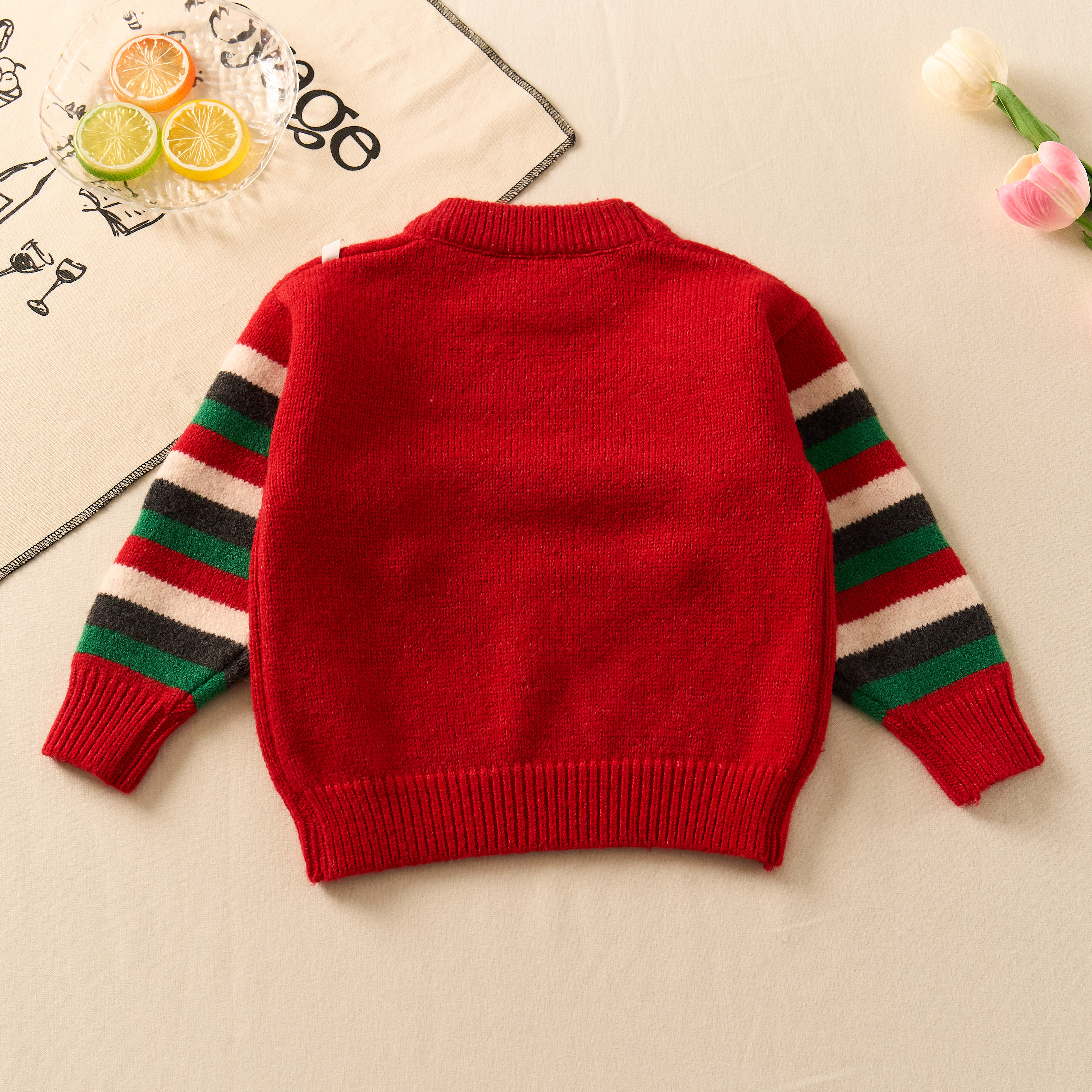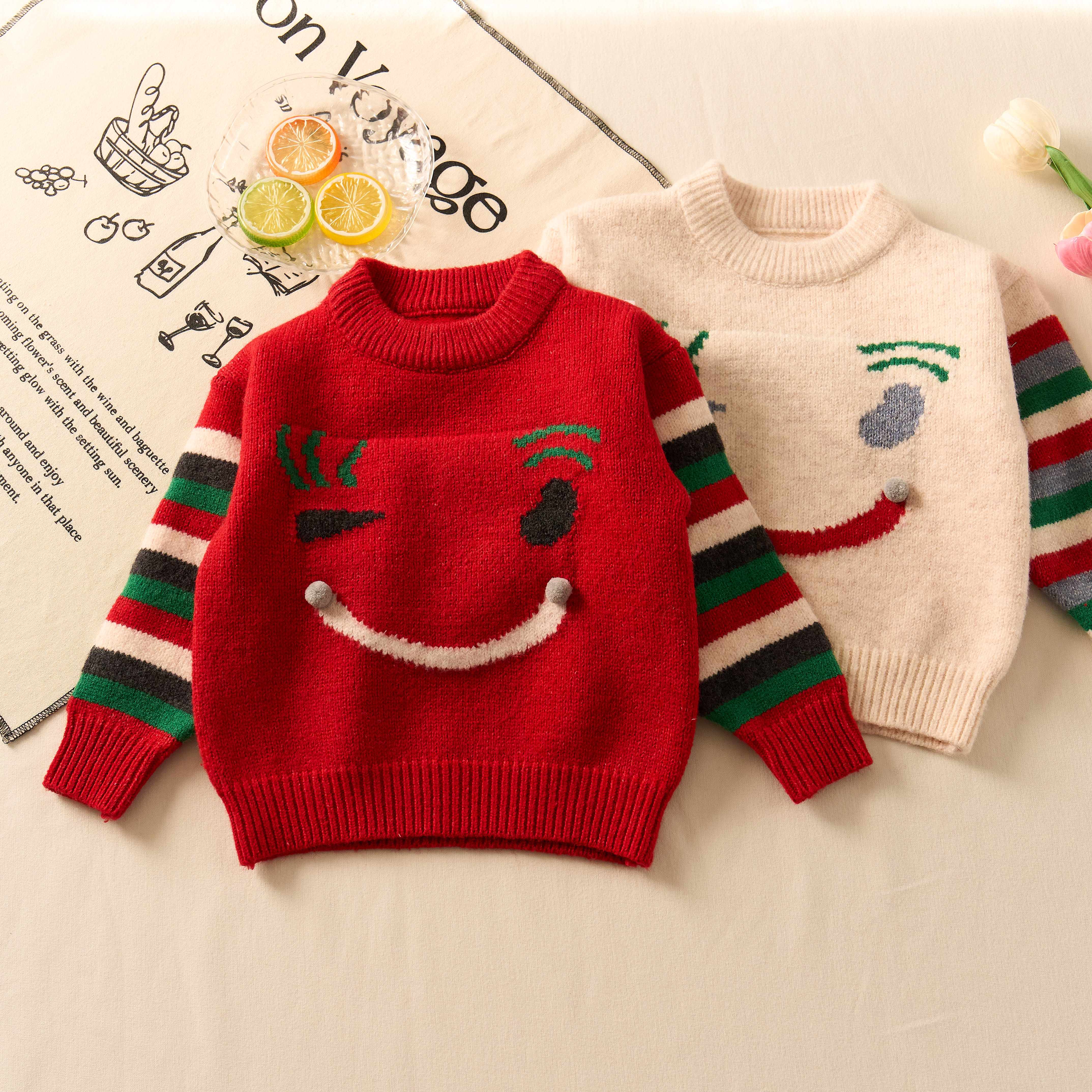 秋冬季简约女童条纹百搭时尚笑脸圆领长袖2025新款中小童针织毛衣