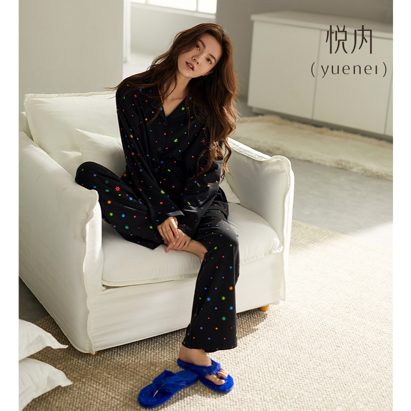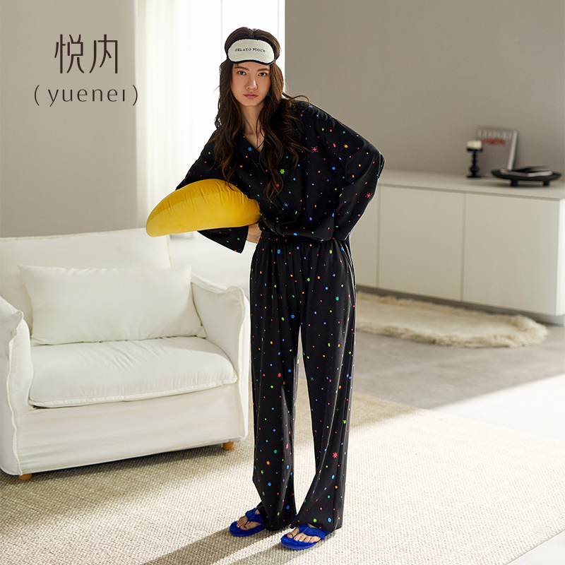 悦内睡衣女春秋款秋季纯棉长袖家居服高级感夏季薄款秋天黑色套装