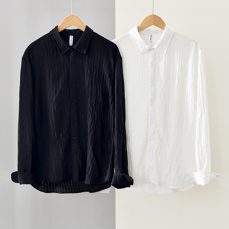 日系复古!褶皱肌理面料!满满高级感!新款男士纯色休闲长袖衬衫