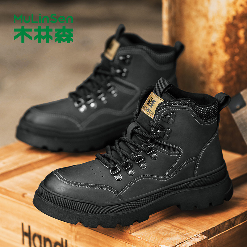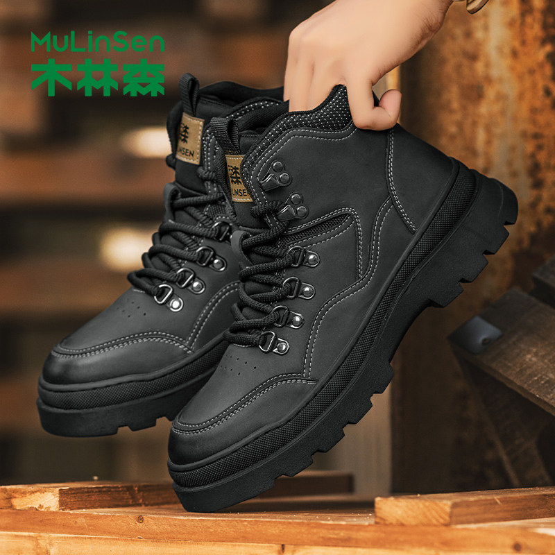 木林森大黄靴男款2025冬季新款高帮英伦风工装靴厚底登山鞋马丁靴