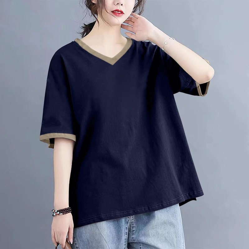 外贸出口清仓100%纯棉短袖休闲T恤女2025新款大码减龄V领上衣夏季