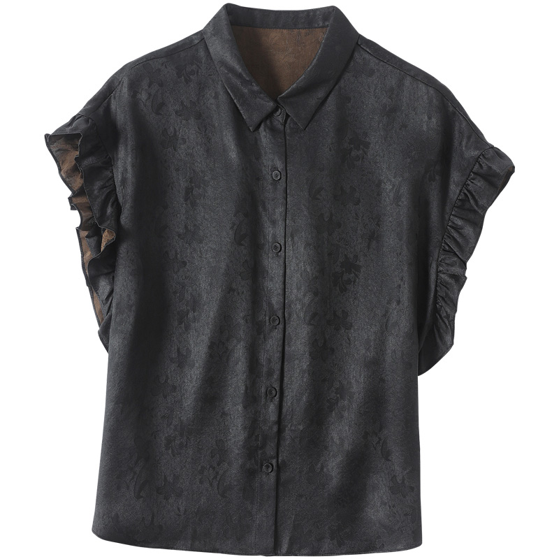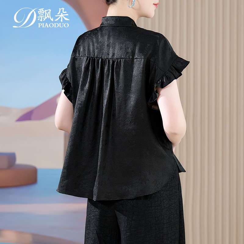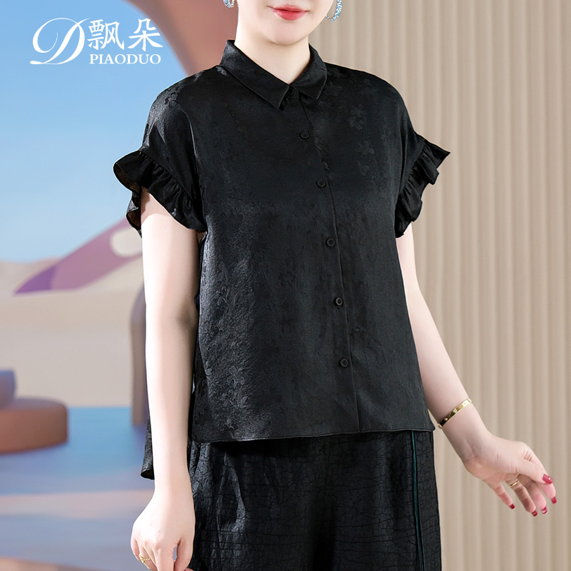 飘朵香云纱真丝上衣女短袖2025夏季新款黑色桑蚕丝新中式妈妈衬衫