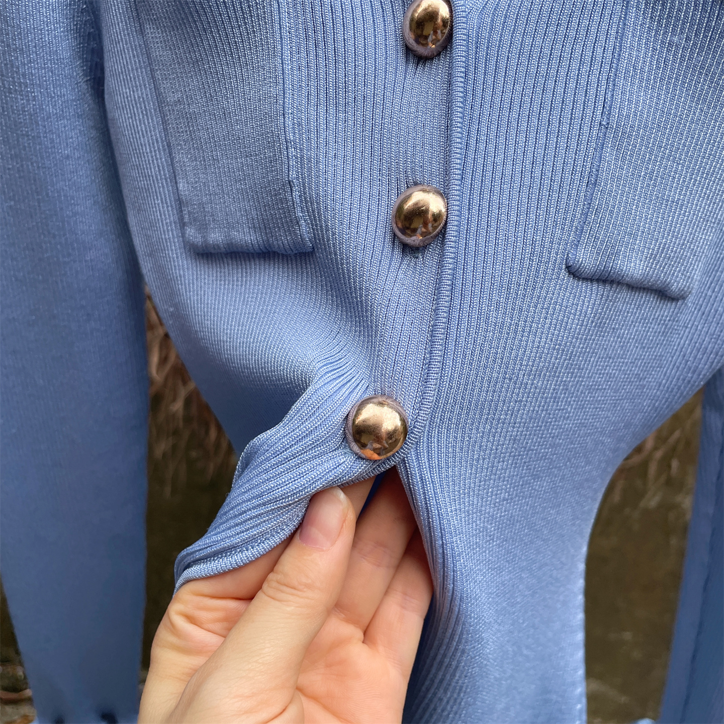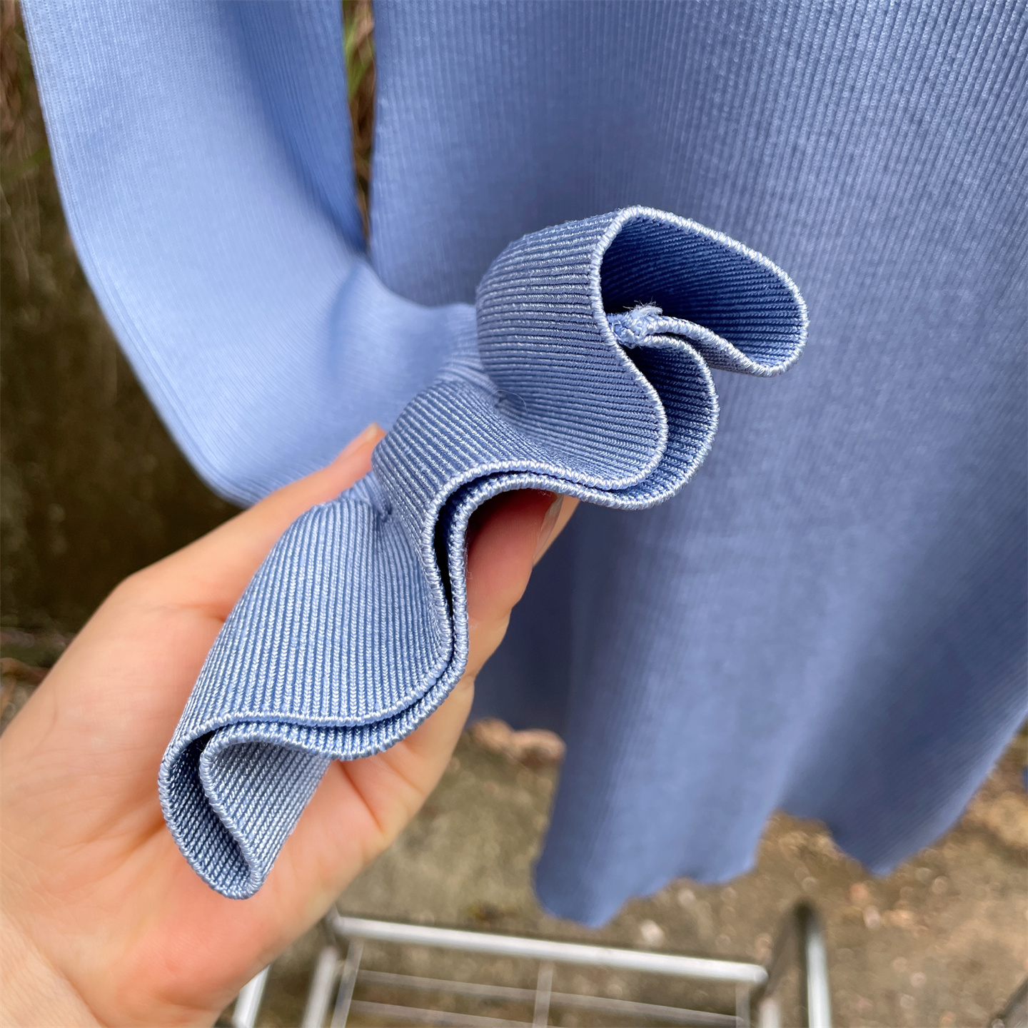 明星同款蓝色POLO领喇叭袖薄款针织开衫女修身甜美减龄中长款上衣