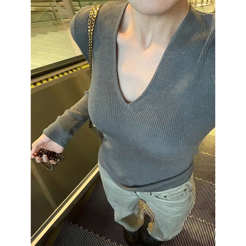 温柔风纯色V领针织衫女2025春秋新款修身显瘦内搭长袖打底衫毛衣