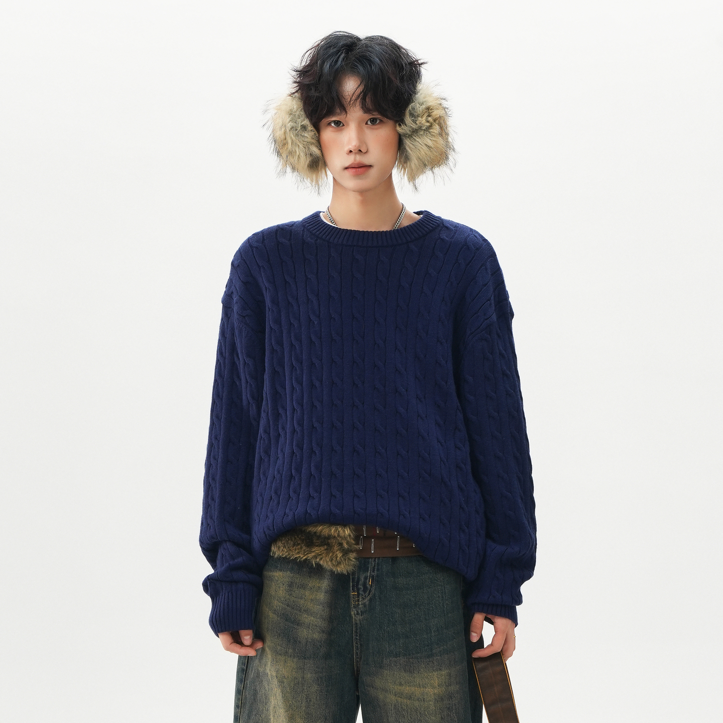 悟空有货秋冬复古麻花圆领针织衫男潮牌宽松情侣休闲百搭套头毛衣