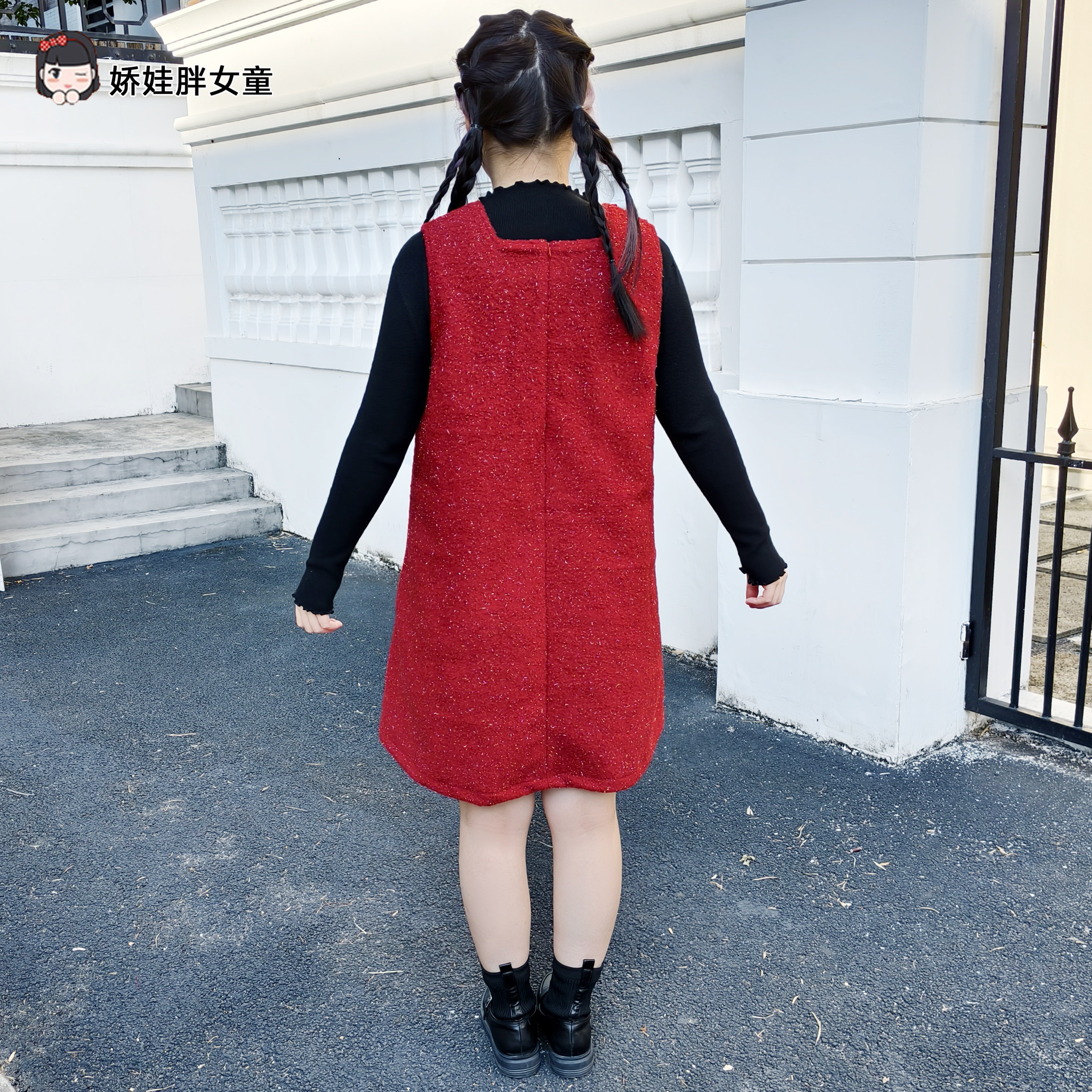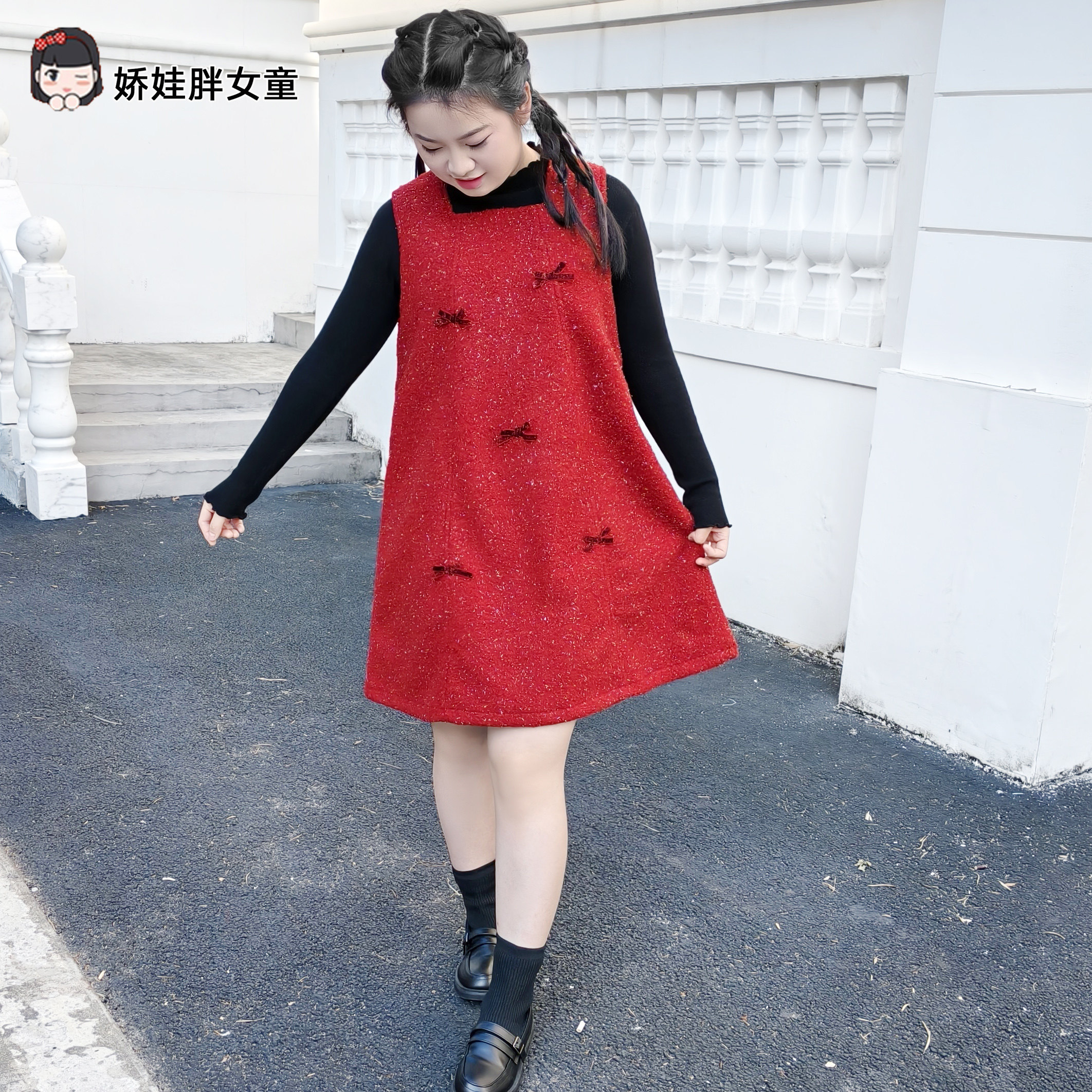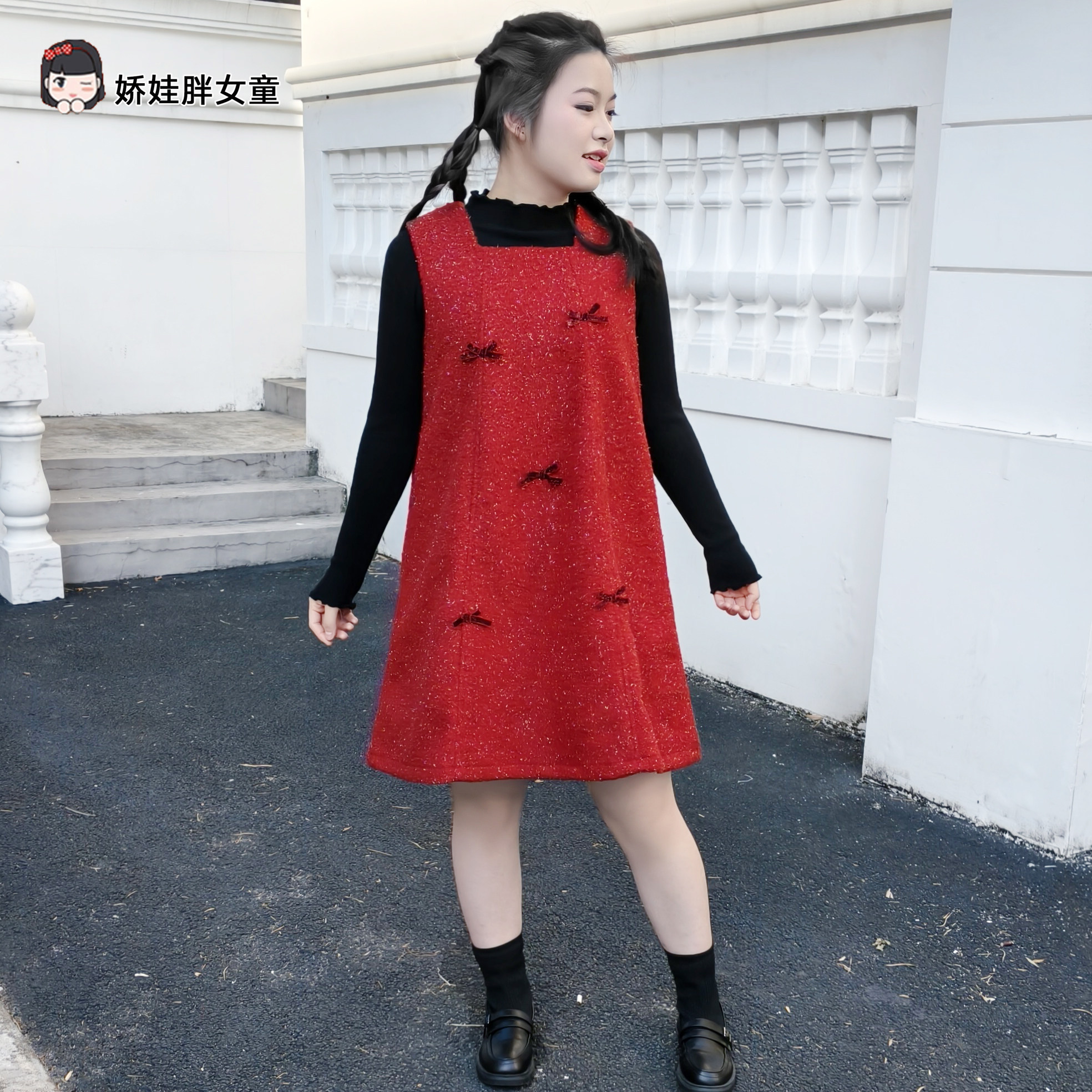 胖女童红色蝴蝶结连衣裙女大童秋冬洋气背心裙+针织打底套装新年