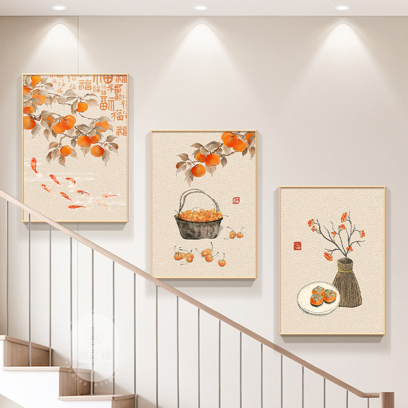 葫芦福字楼梯角挂画新中式别墅走廊过道装饰画柿柿如意背景墙壁画