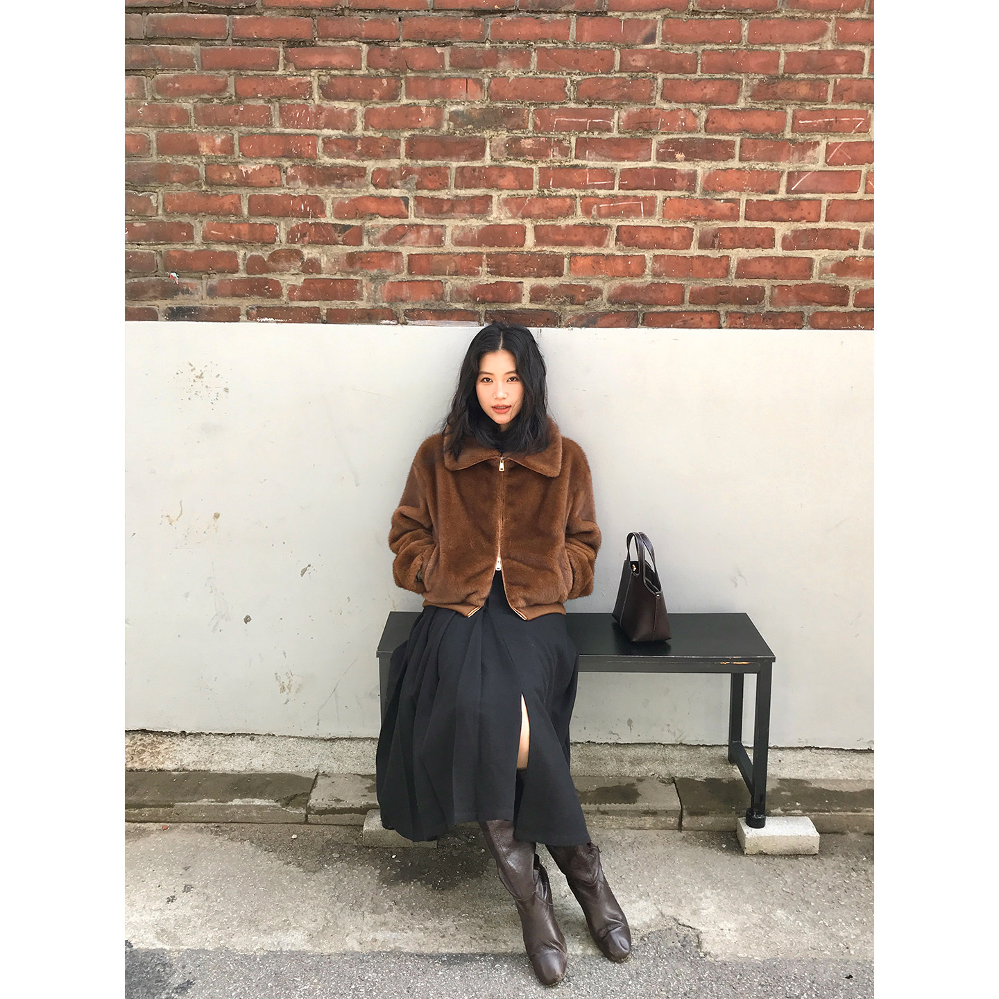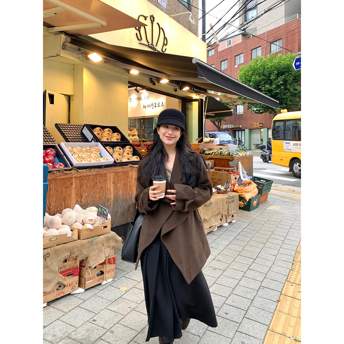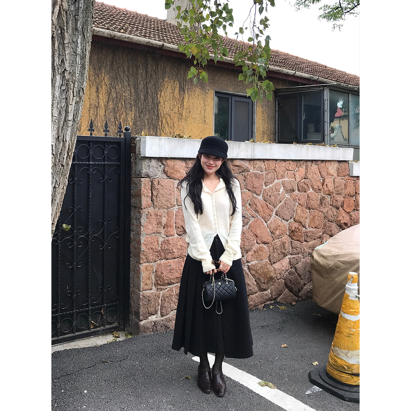 DaqianwithU 黑色百褶呢子半身裙女秋冬休闲百搭高腰A字显瘦长裙