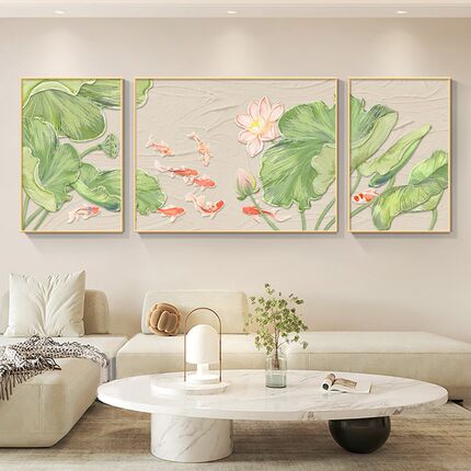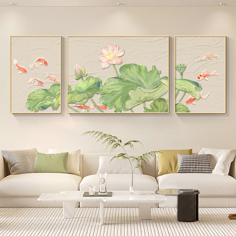 荷花九鱼图壁画客厅挂画现代简约绿色沙发背景墙装饰画新中式油画