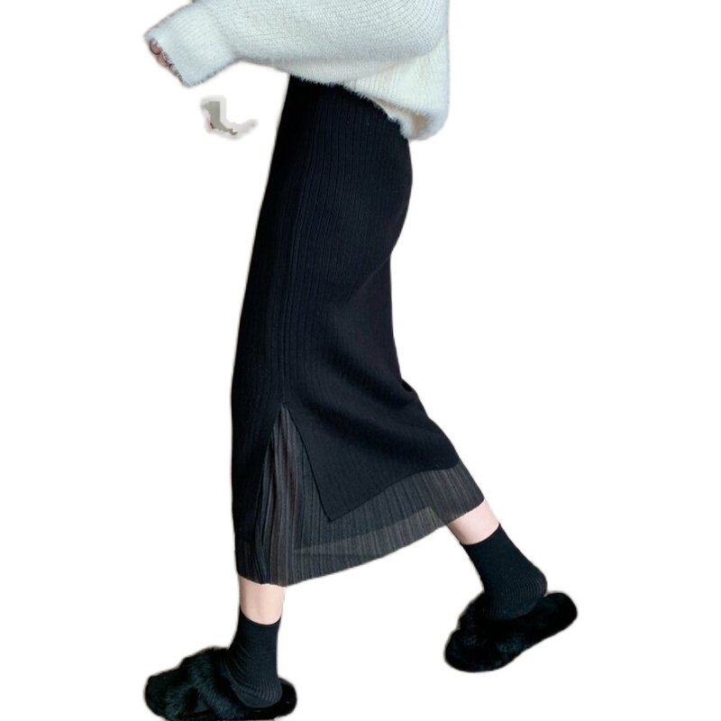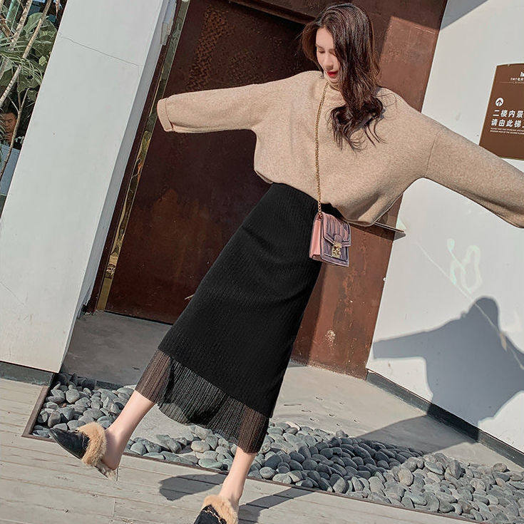 秋冬装新款高腰a字洋气开叉针织半身裙女中长款百搭蕾丝包臀裙子