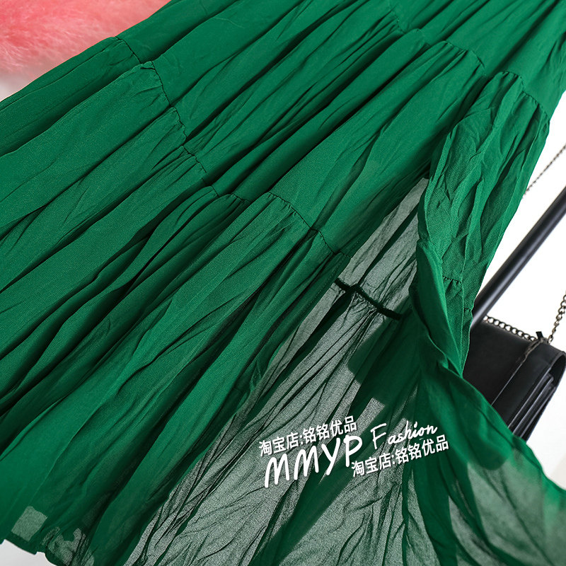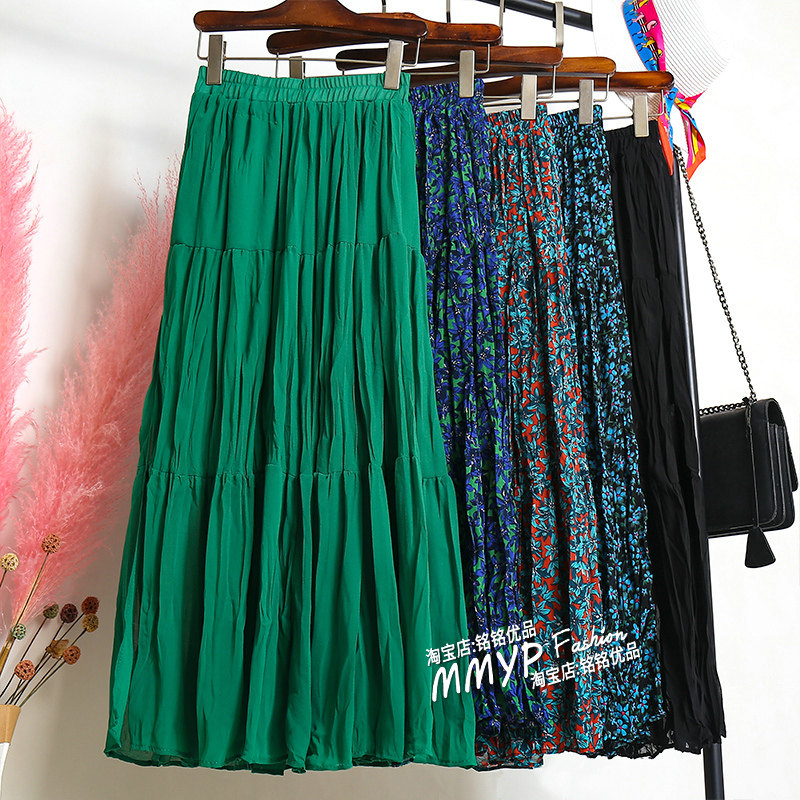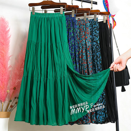 开叉绿色雪纺褶皱半身裙女夏中长款高腰百褶蛋糕半裙垂感长裙薄款