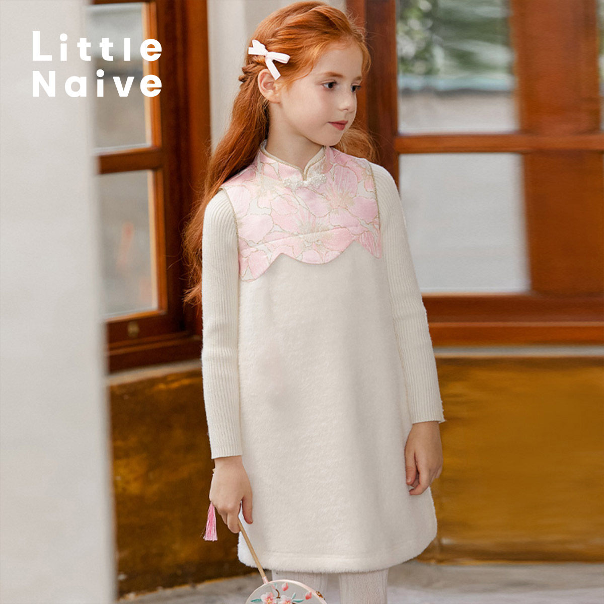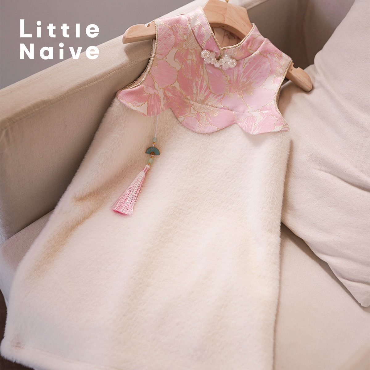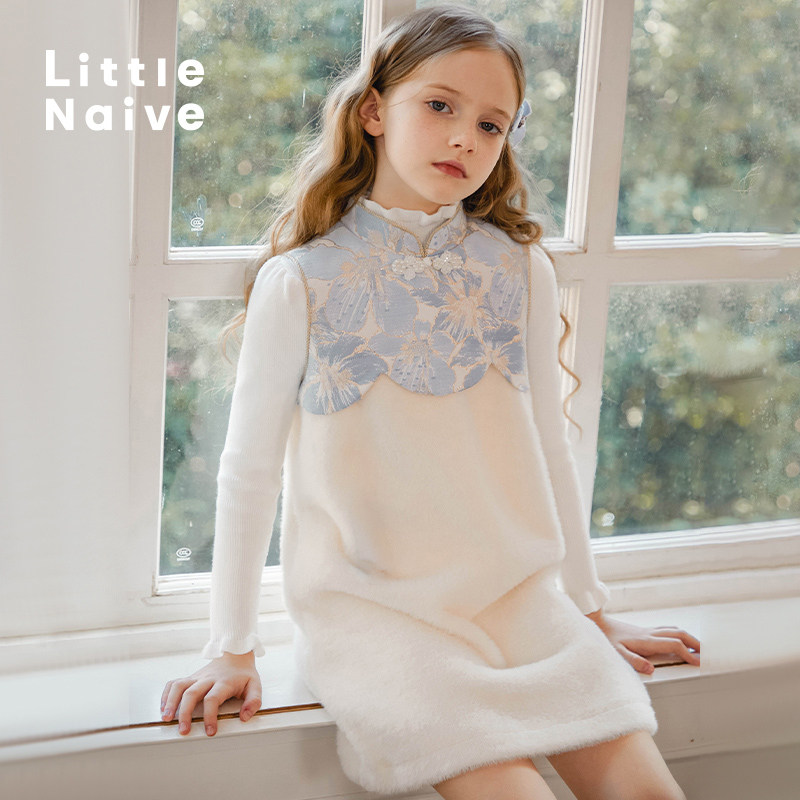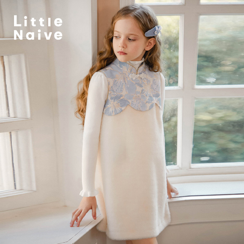 LittleNaive女童加绒旗袍秋冬金貂绒中式背心裙儿童中国风连衣裙