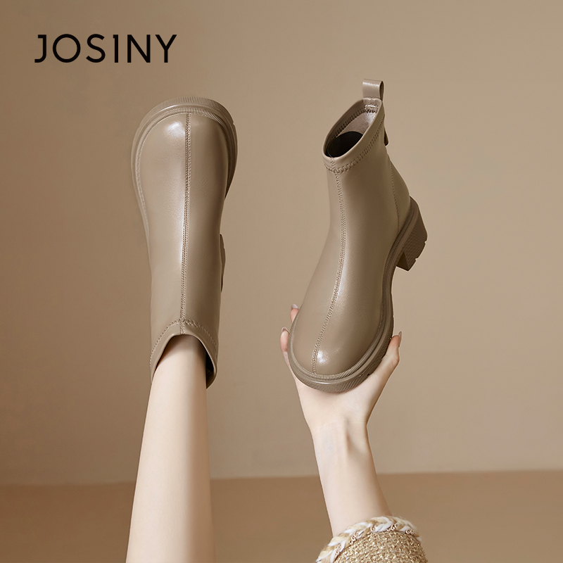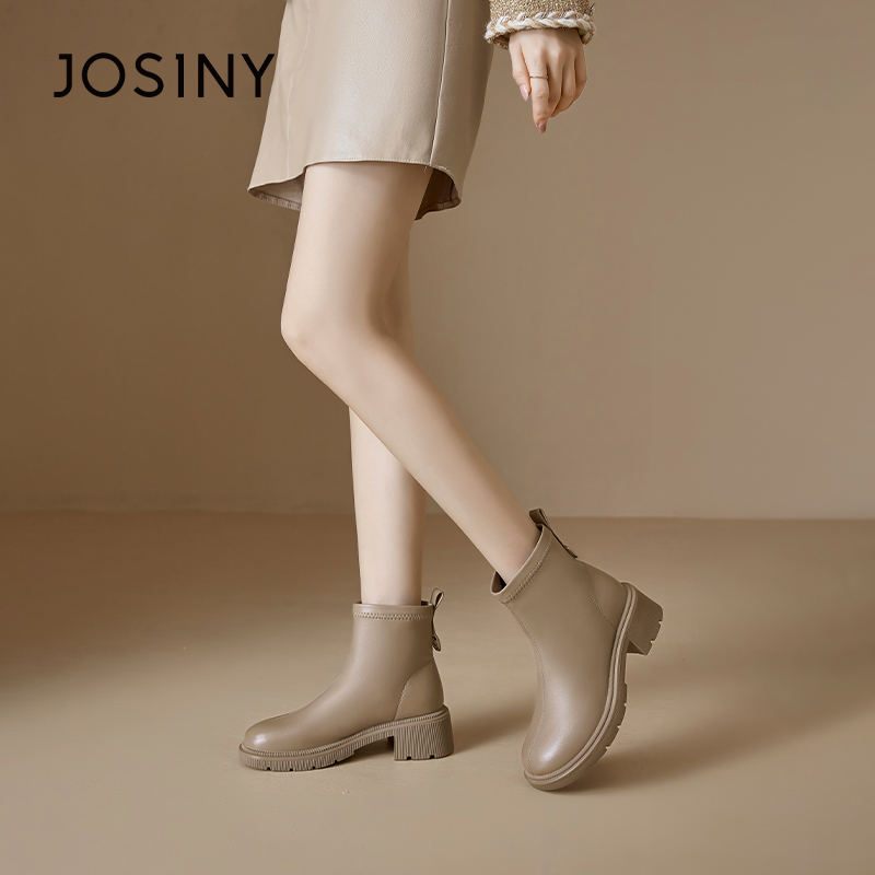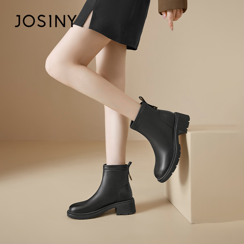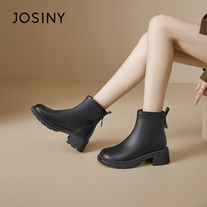 卓诗尼冬季新款女士短筒靴子圆头后拉链加绒保暖棉靴休闲时装百搭
