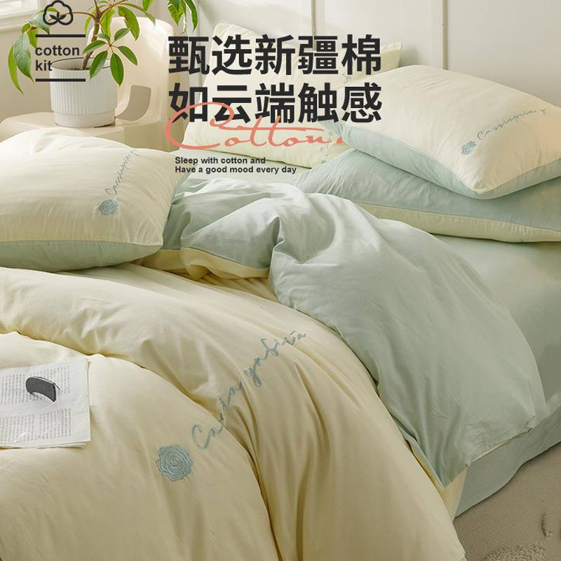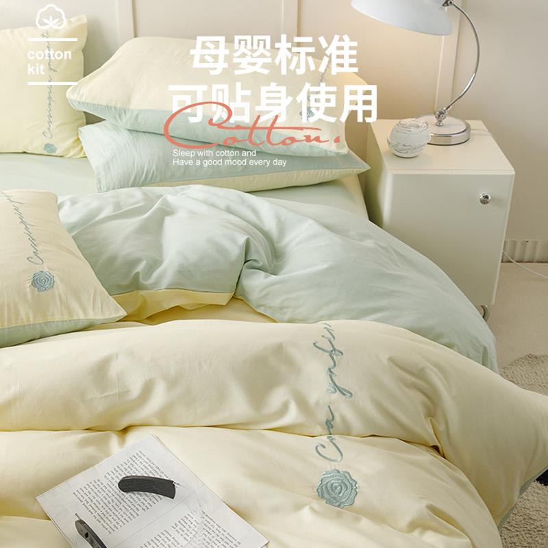 ins纯棉四件式简约刺绣全棉床单被套三件套单人2024新款床上用品
