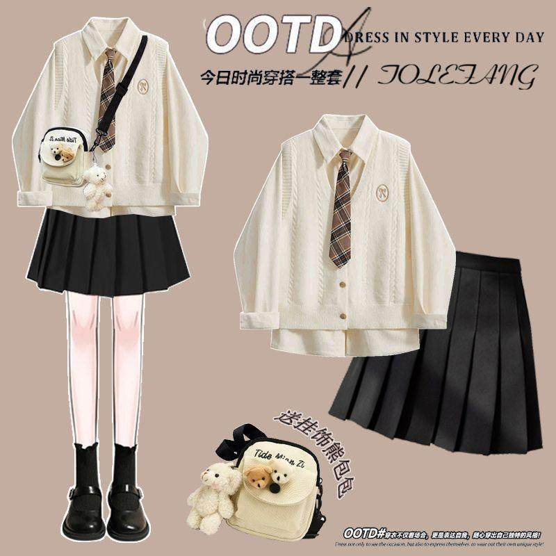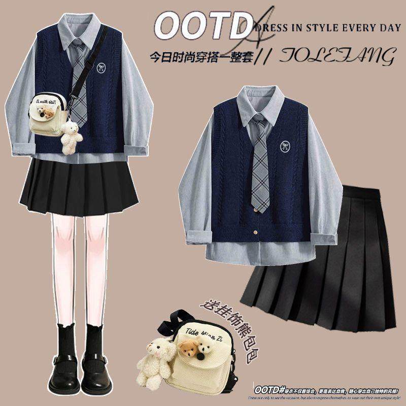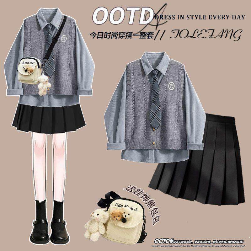 秋季套装女学生韩版宽松学院风长袖衬衫+针织马甲毛衣背心两件套
